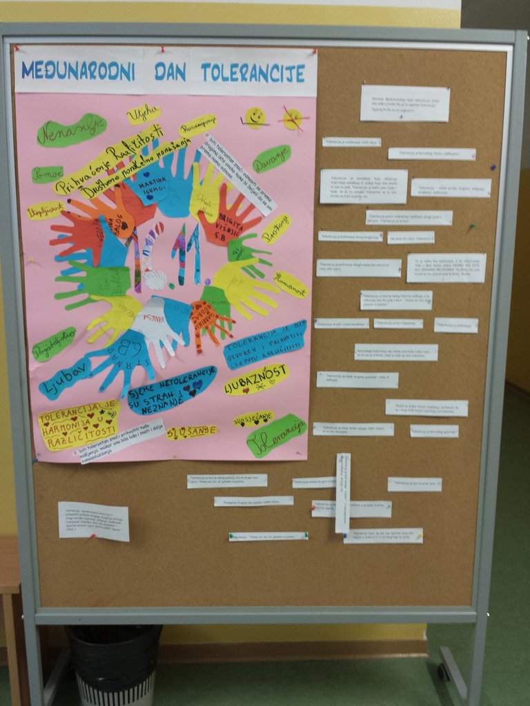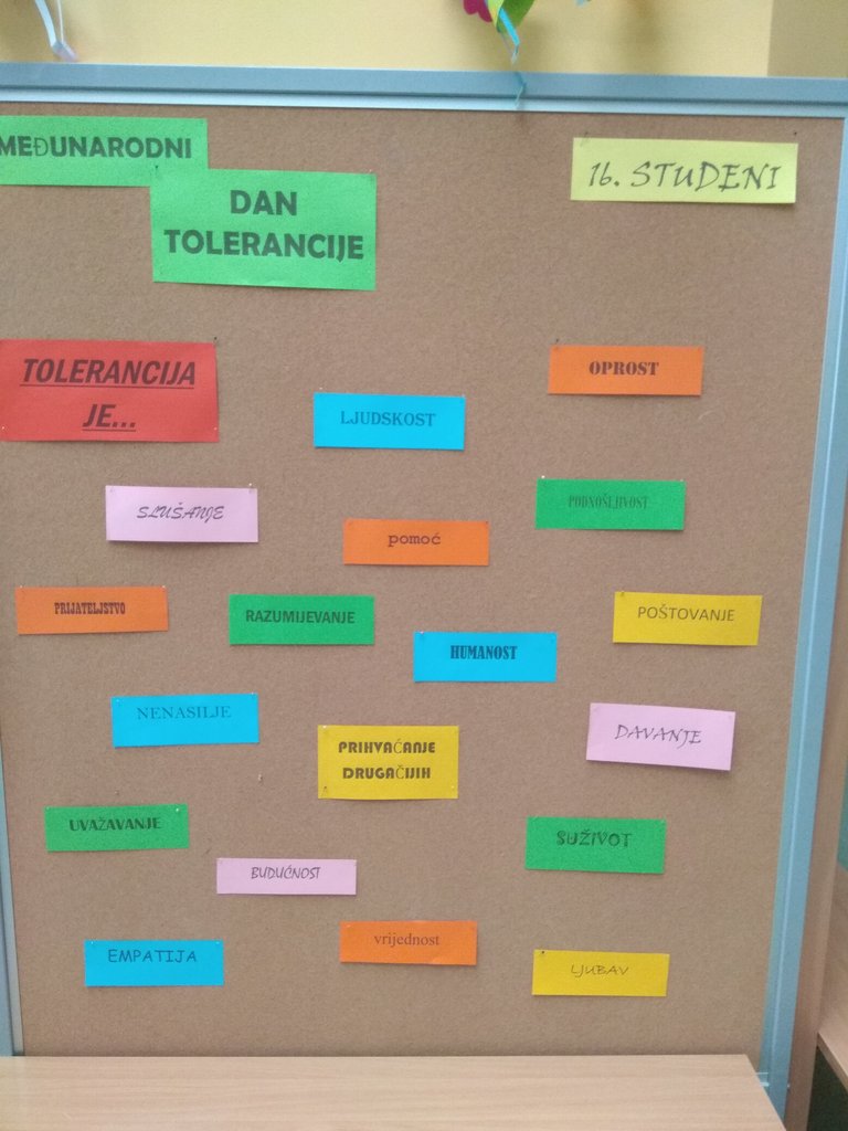 Dana 14.11.2017. na sastanku Vijeća učenika obilježili smo Međunarodni dan tolerancije. U osmišljavanju aktivnosti za sastanak pomogli su nam članovi grupe English Corner pod vodstvom učiteljice Adele Tompoš.