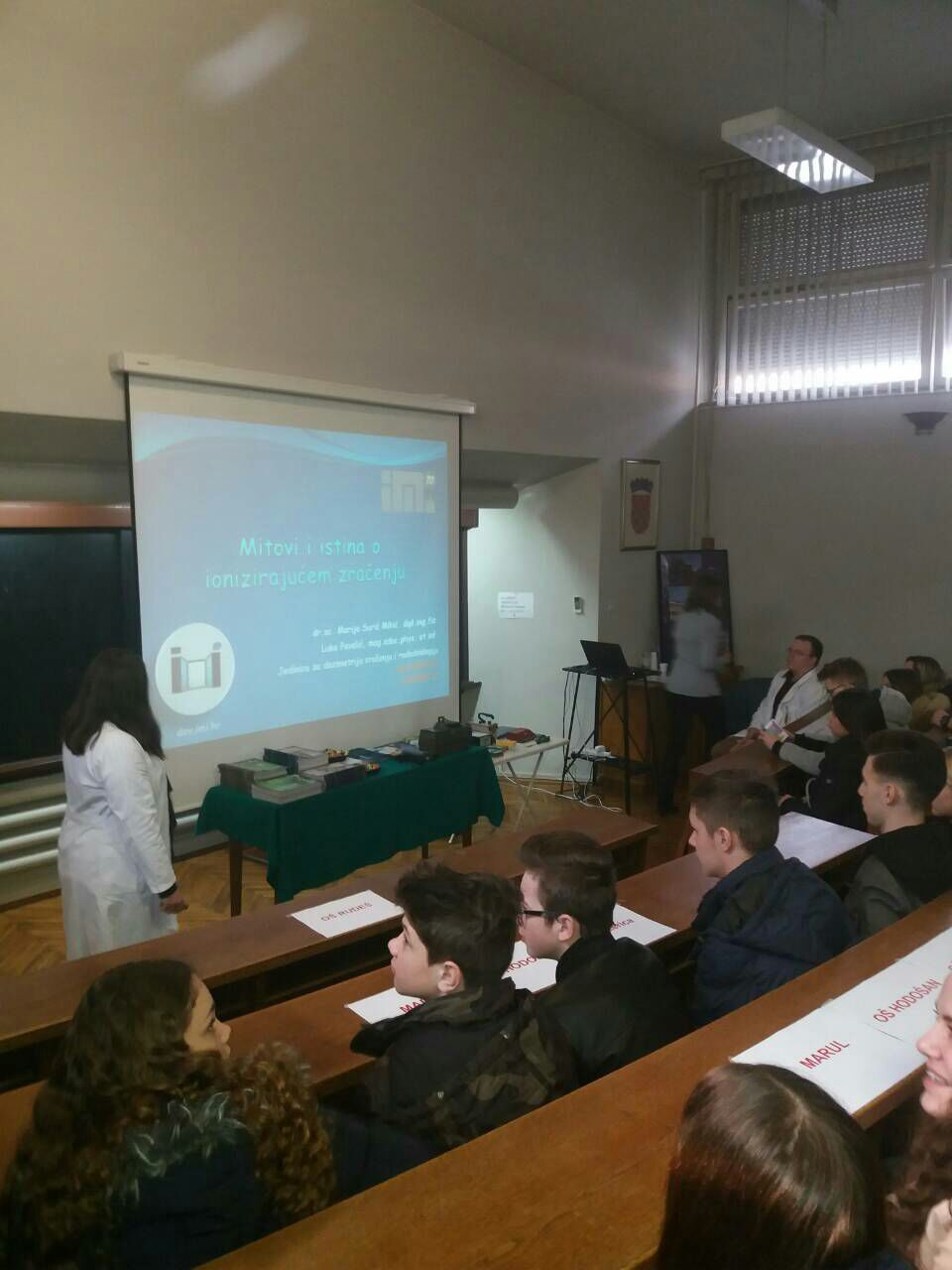 Neka od predavanja bila su na temu novih teorija postanka živog svijeta (živi svijet je nastao na kometu i kad je komet pao na Zemlju, živi svijet se dalje raširio Zemljom), ionizirajuće zračenje, kako iz vlasi kose odrediti je li osoba uzimala drogu, djelovanje protutumorskih lijekova na ekosustav, putovanje kroz stanice i mnoga druga. Stručnjaci su nam i uživo pokazali kako izmjeriti količinu ionizirajućeg zračenja. U laboratoriju smo određivali gdje je u Zagrebu zrak najzagađeniji. Nakon pokusa smo zaključili da je najzagađeniji u Novom Zagrebu. Nakon predavanja i radionica mogli smo slobodno iskoristiti vrijeme. Veselimo se idućoj edukaciji!