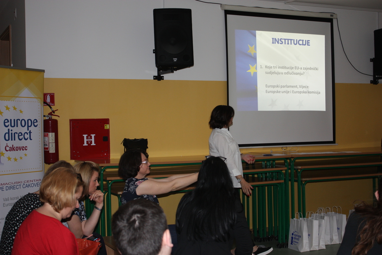 U našoj školi danas je održano finale 16. natjecanja EU-KVIZ za Međimursku županiju kojoj je glavni organizator Informacijski centar EUROPE DIRECT Čakovec (EDIC) i Odjel za europske poslove u suradnji s Međimurskom županijom, a povodom obilježavanja Dana Međimurske županije i Europskog tjedna za učenike sedmih razreda osnovnih škola.