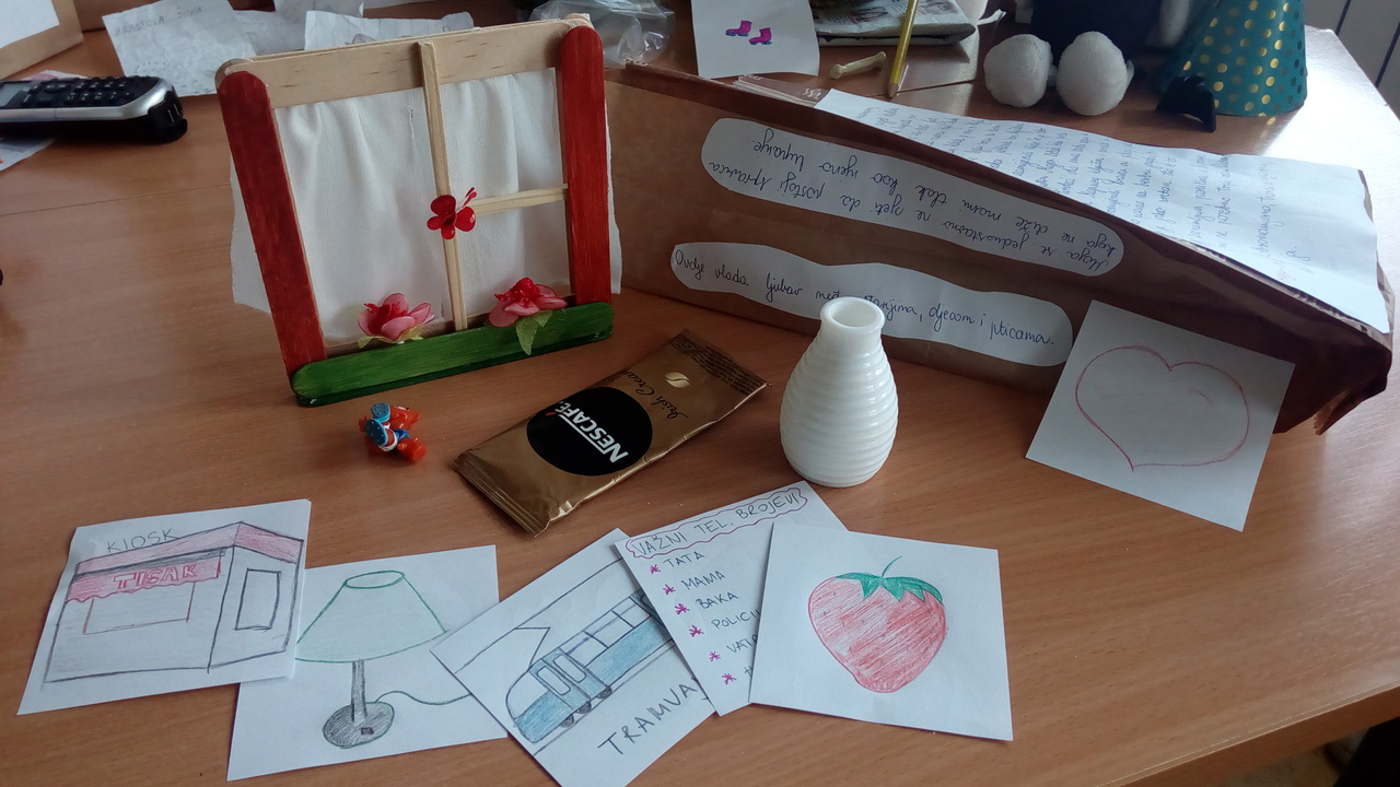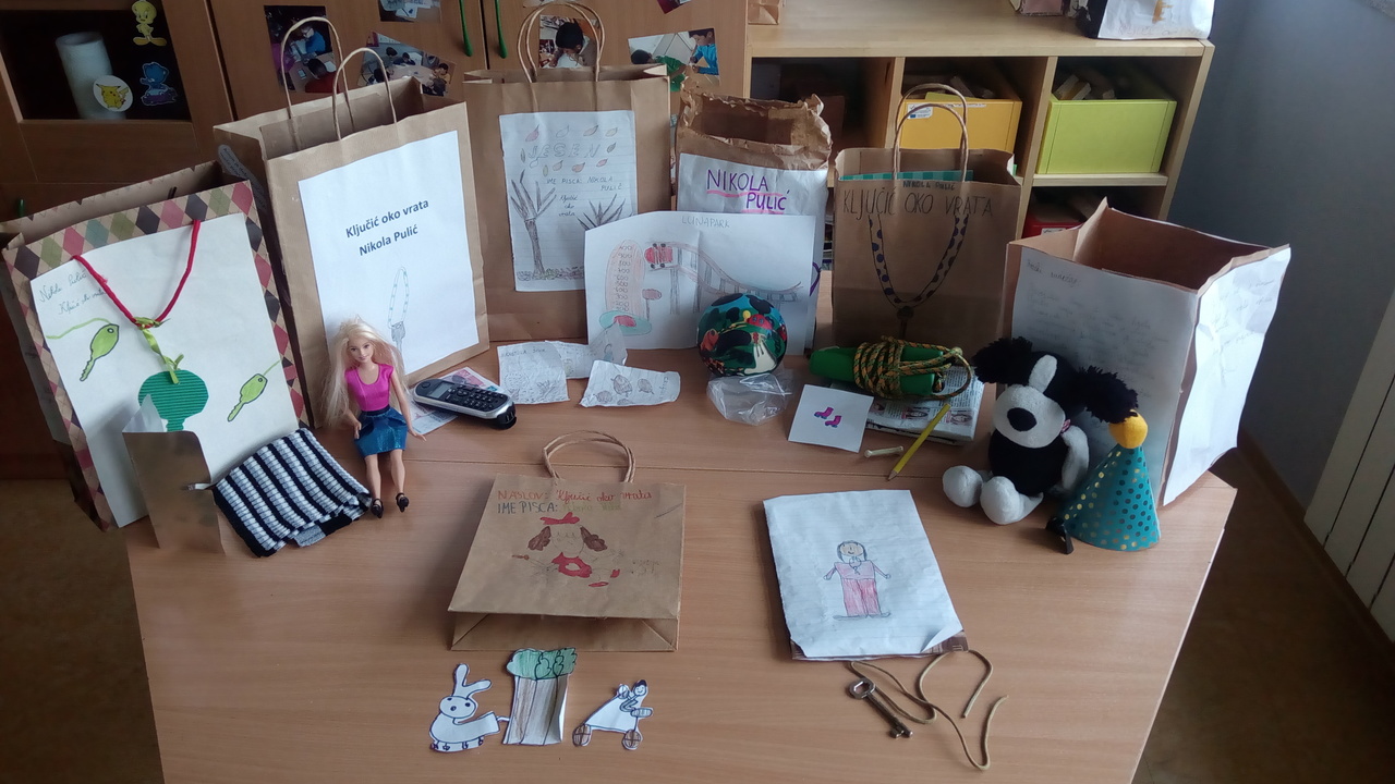 Najprije smo bili zbunjeni, no kad smo shvatili što trebamo raditi bili smo jako uzbuđeni i nestrpljivi. Da, dobro ste pročitali! Jedva smo čekali krenuti s čitanjem! Uz neke uobičajene lektirne zadatke, koji smo ovaj put s veseljem odradili, trebali smo oslikati naslovnicu na jednoj strani papirnate vrećice ili „škrnicla“. Na bočne strane smo tijekom čitanja pisali neke smiješne, mudre ili nama zanimljive rečenice. Ono najbolje nalazilo se u samoj vrećici: deset predmeta koji su na bilo koji način vezani za pročitano djelo. Trebali smo biti dosjetljivi i pokušati staviti predmete (ili ih nacrtati ako su preveliki za vrećicu) za koje smo smatrali da ih drugi neće. Tijekom prezentacije, iz vrećice smo izvlačili predmete i objašnjavali kako su oni vezani uz radnju romana.
