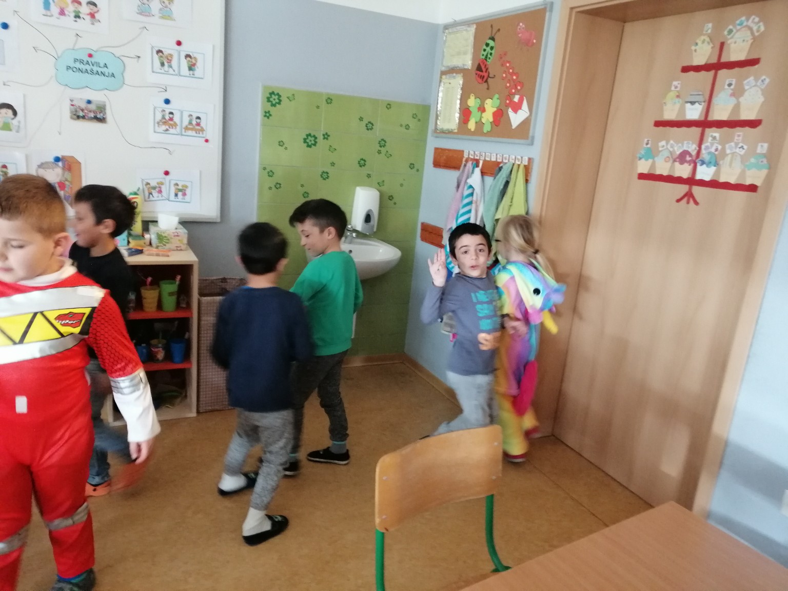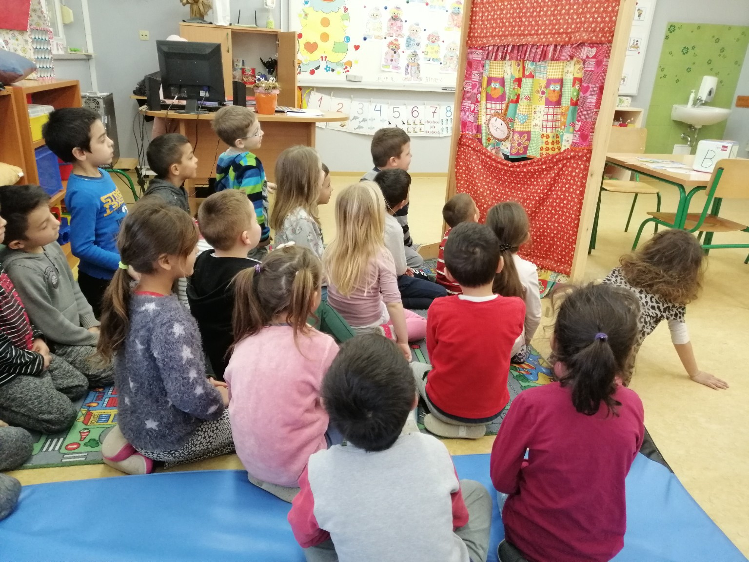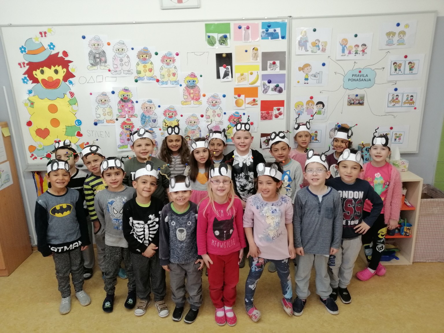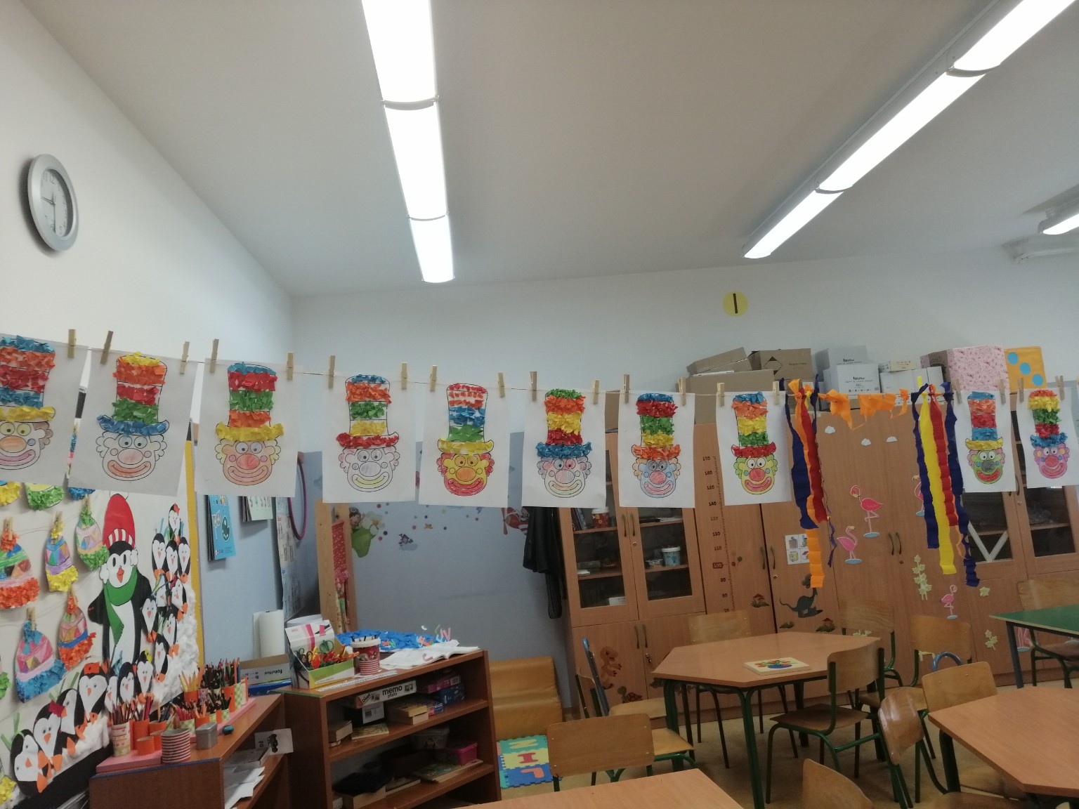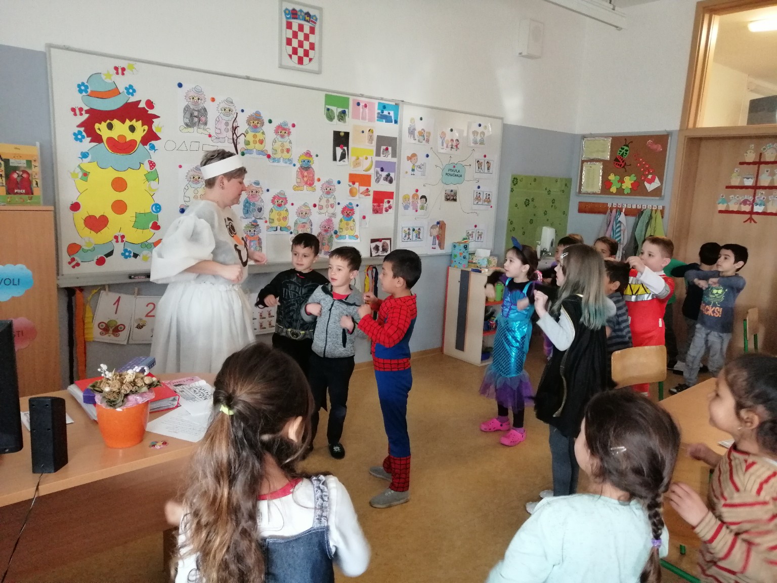 Sobu dnevnog boravka ogrnuli smo fašničkim ruhom: sa ploče nas je budnim okom promatrao veliki klaun, a na konopce smo objesili resice šarenih boja. Okušali smo se u dramatizaciji igrokaza „Karneval“ i „Maskenbalske šale“ pomoću štapnih lutaka koje su nam izradili učenici polaznici Likovne radionice pod vodstvom učiteljice Tatjane Šafarić. Zahvaljujemo im na tome.
