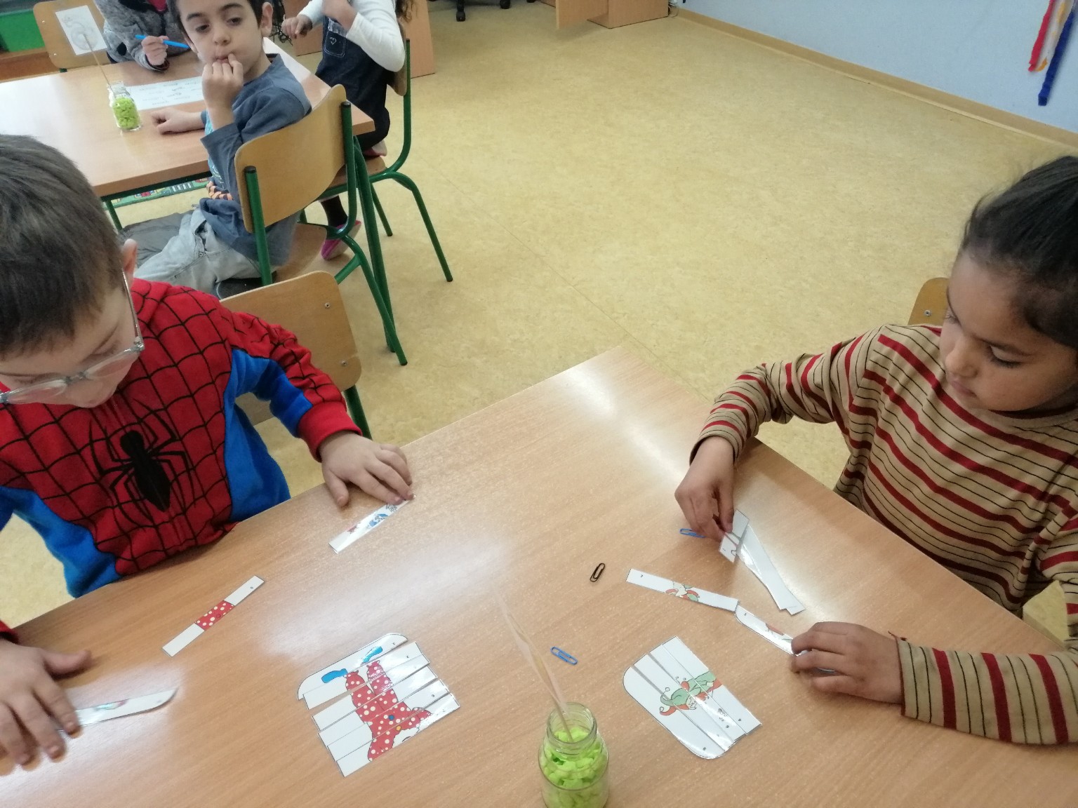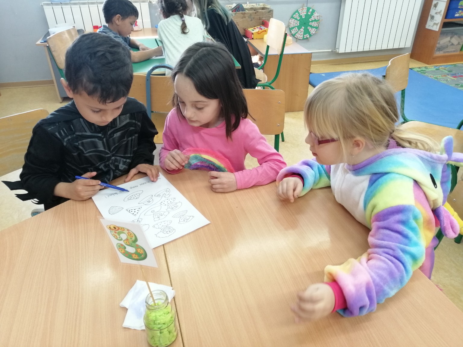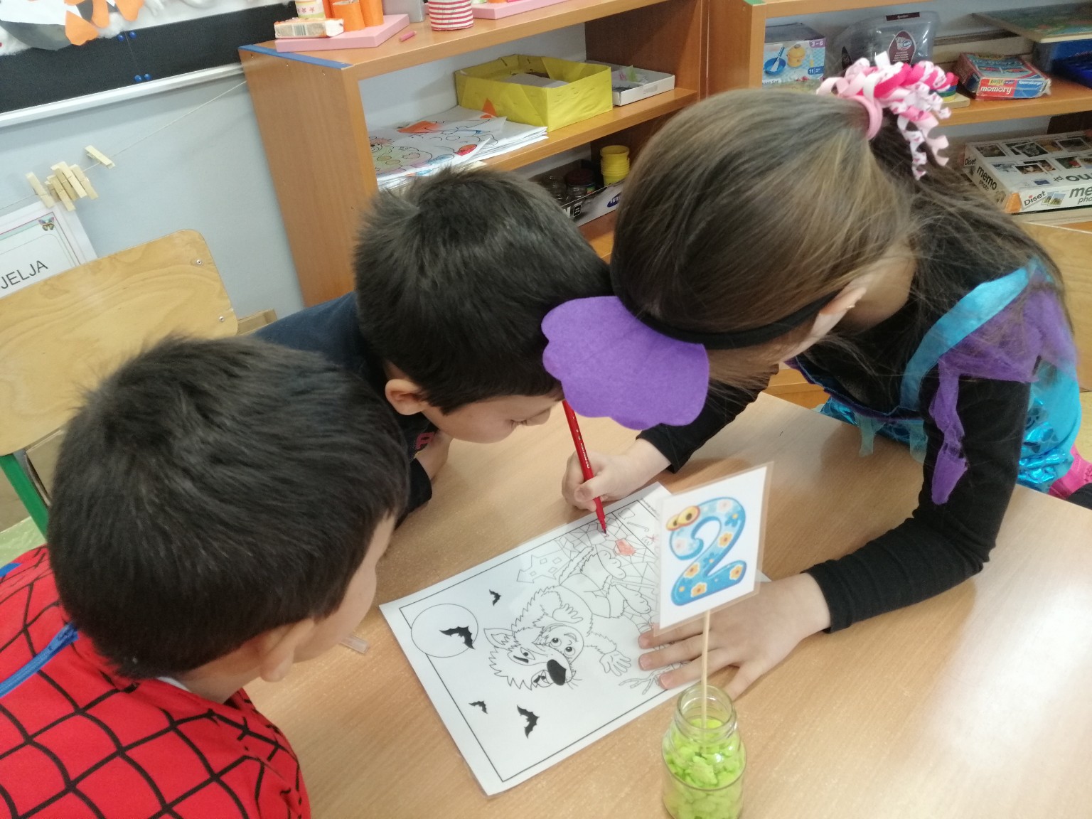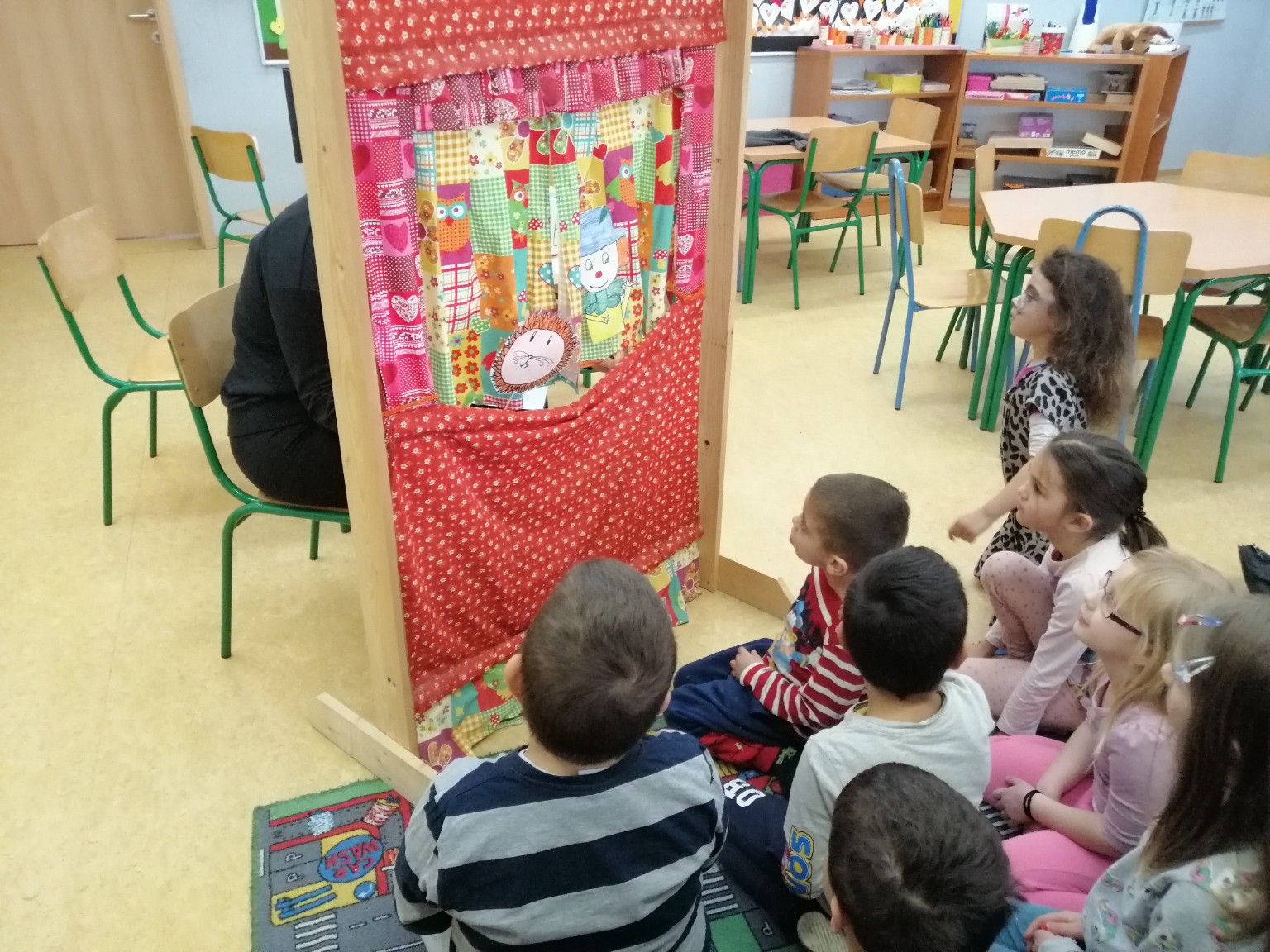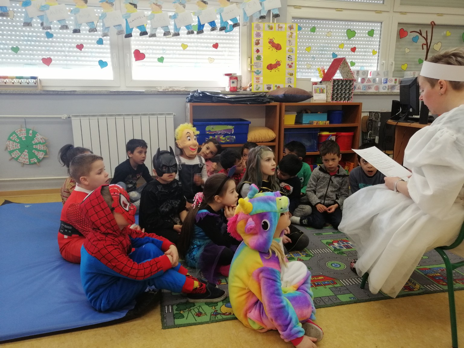 Sobu dnevnog boravka ogrnuli smo fašničkim ruhom: sa ploče nas je budnim okom promatrao veliki klaun, a na konopce smo objesili resice šarenih boja. Okušali smo se u dramatizaciji igrokaza „Karneval“ i „Maskenbalske šale“ pomoću štapnih lutaka koje su nam izradili učenici polaznici Likovne radionice pod vodstvom učiteljice Tatjane Šafarić. Zahvaljujemo im na tome.