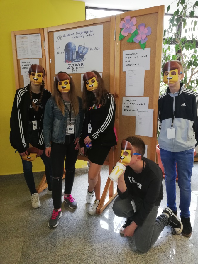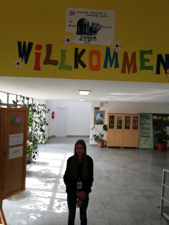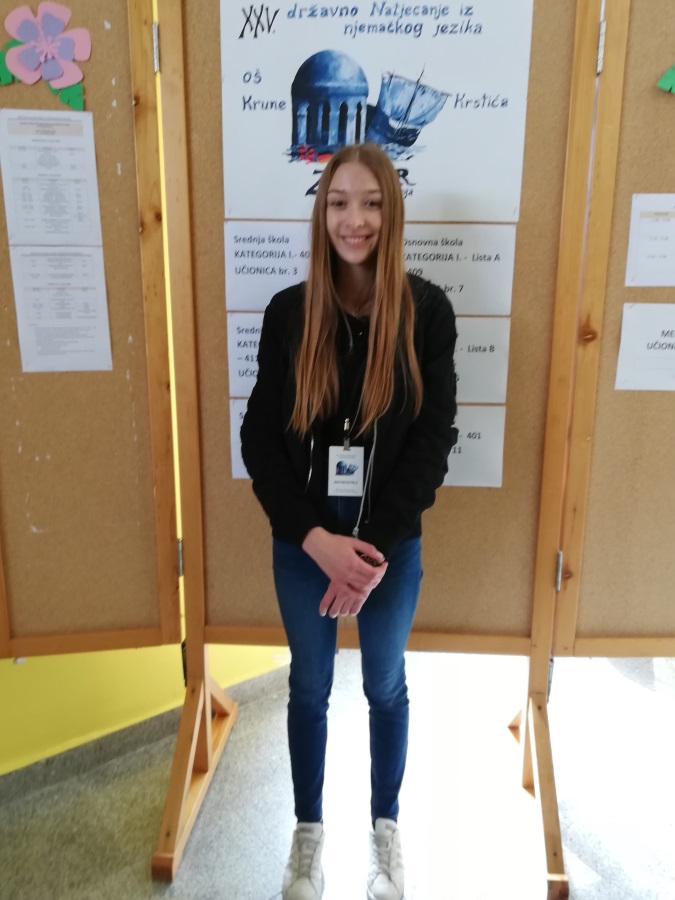 Državno natjecanje iz njemačkoga jezika za osnovne i srednje škole održano je od 8. do 10. travnja 2019. u Osnovnoj školi Krune Krstića u Zadru. Učenica naše škole Vanesa Mesarić iz 8.a razreda sudjelovala je na natjecanju i pokazala zavidno znanje u svim jezičnim vještinama te zauzela odlično 5. mjesto u kategoriji učenika koji uče njemački jezik od 1. razreda OŠ. Učenica je na natjecanju bila u pratnji mentorice Jasminke Dodlek, učiteljice njemačkog jezika.