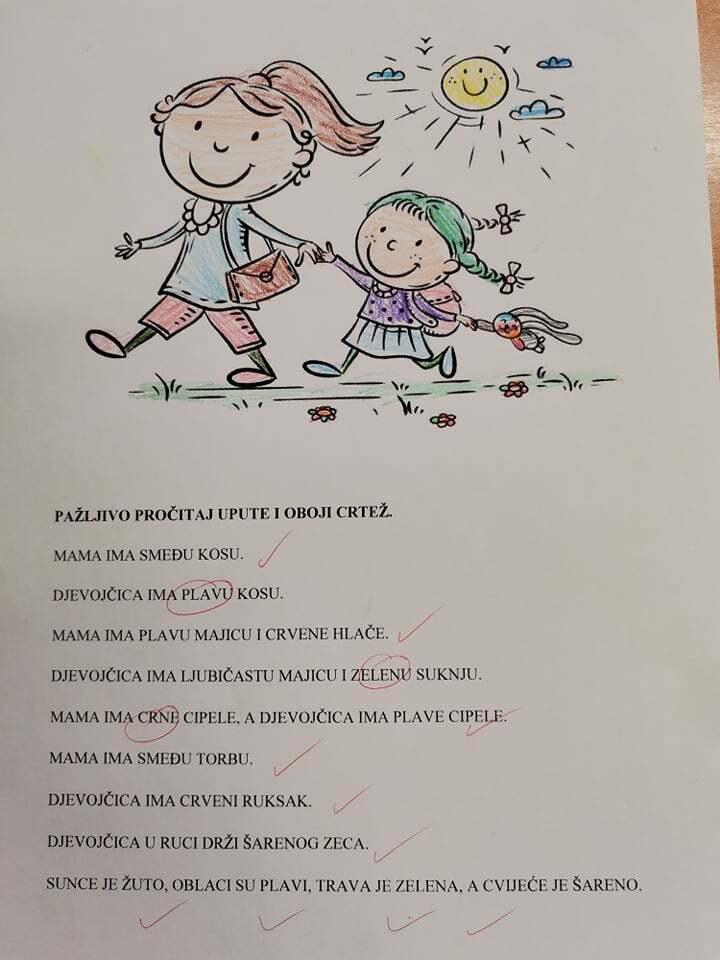 Pažljivo slušajući svoju učiteljicu, učenici moraju ispuniti crtež određenim bojama kako bi stvorili novu sliku. Na taj način ponavljaju boje, prema uputama u tekstu moraju pobojati crtež i prepoznati o kojoj je boji riječ.