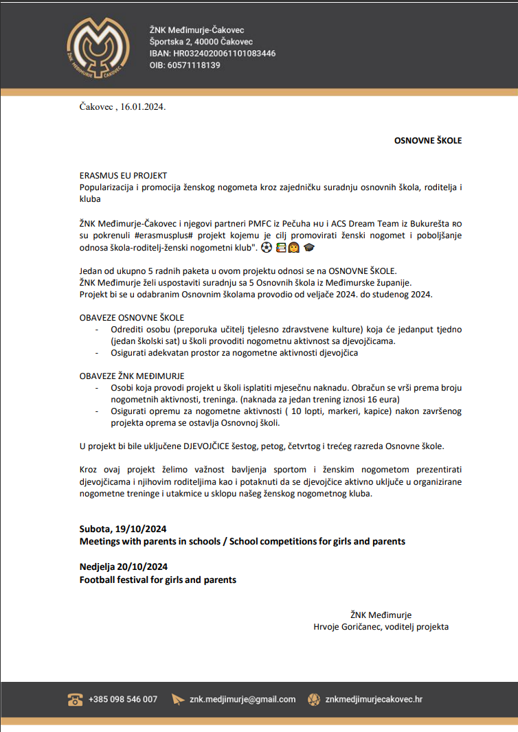 Ženski nogometni klub Međimurje sutra u petak 1.3.2024. godine u 18,00 sati u prostorijama škole upisuje učenice naše škole u školu nogometa. Treninzi će se održavati petkom u 18,00 sati u dvorani škole.