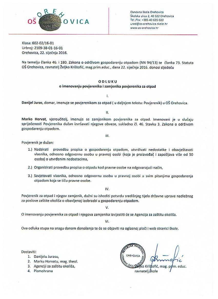 Odluka o imenovanju povjerenika i zamjenika povjerenika za otpad
