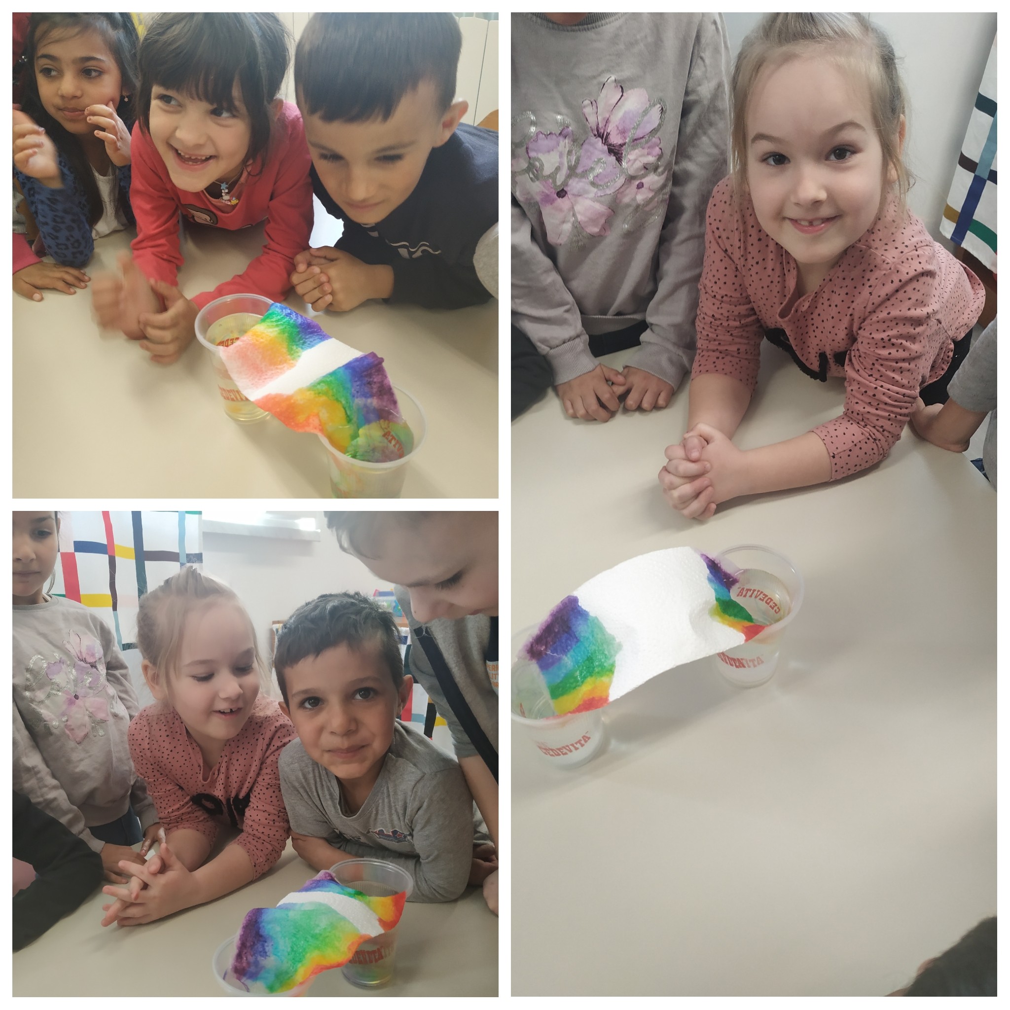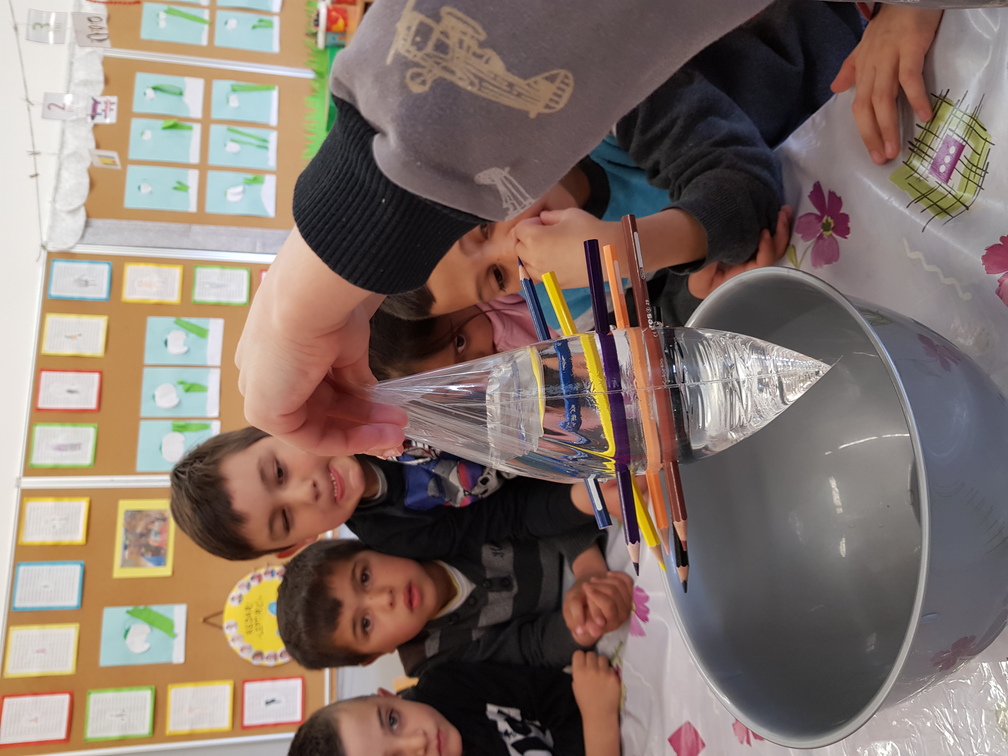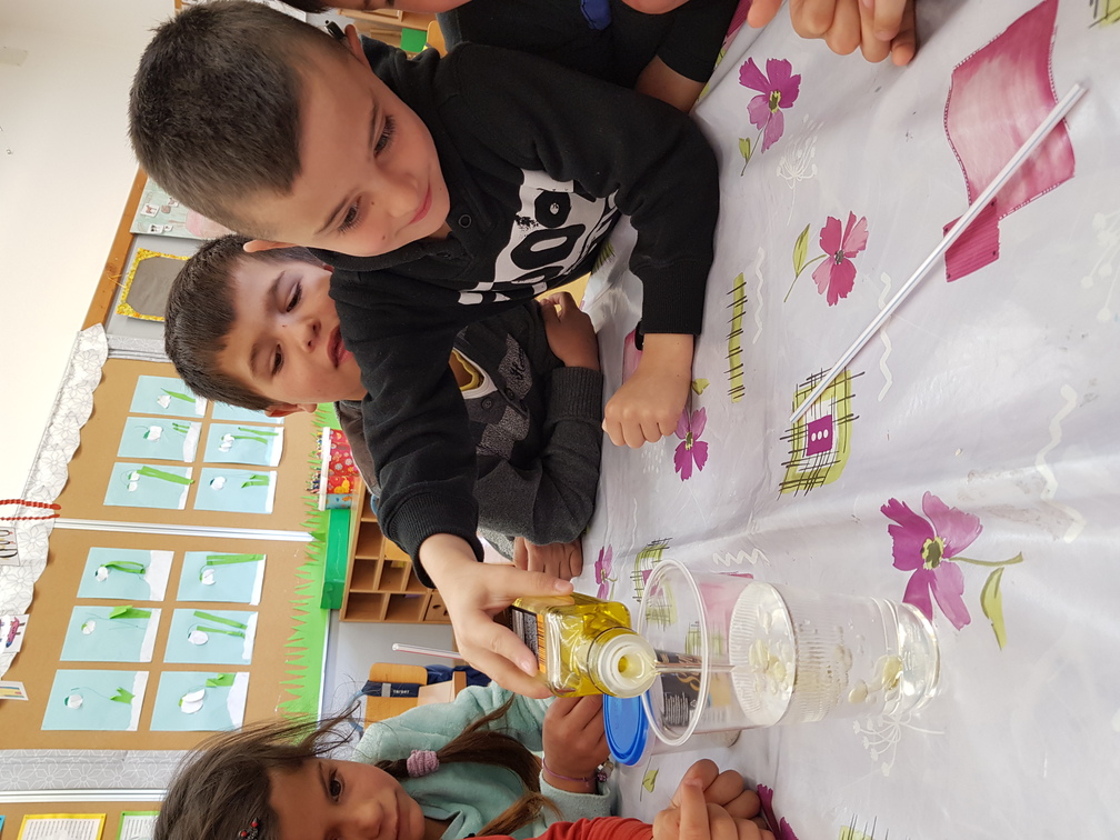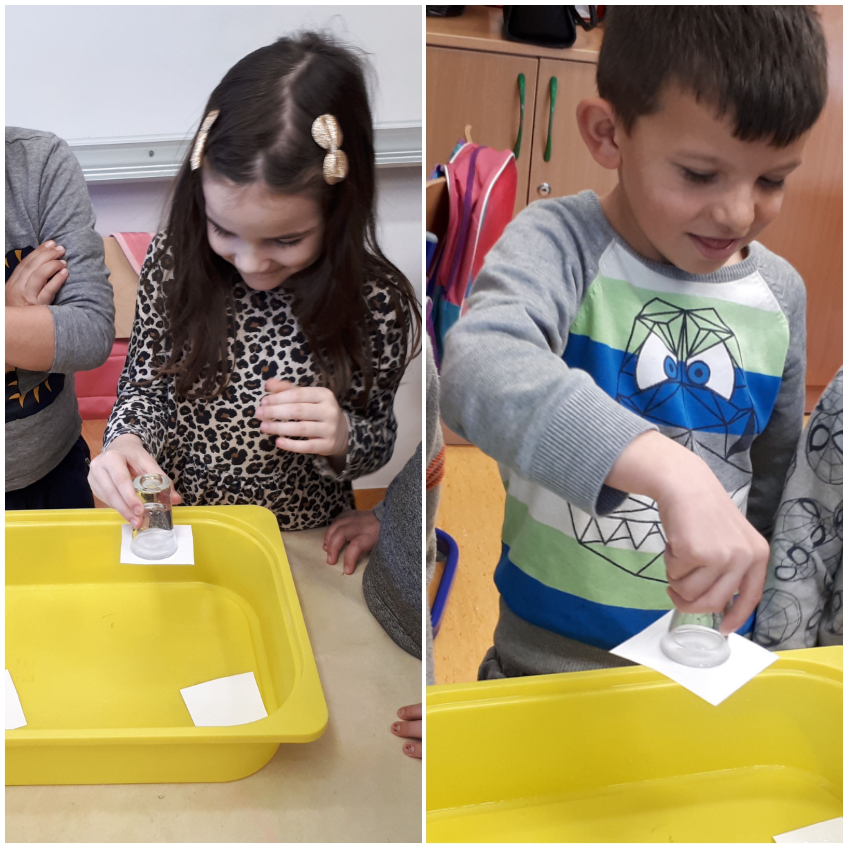 „Pčelice“ su najprije odslušale slikovnicu o kišnoj kapi i naučile sve o kruženju vode u prirodi. Nakon slušanja slikovnice krenuli smo u istraživanje vode i svih njezinih mogućnosti. Najprije smo istraživali kapilarni učinak vode i dobili prekrasnu dugu. Zatim smo u staklenku stavili vodu, boju i jestivo ulje. Zaključili smo da je ulje lakše, jer ono pluta. U sve to smo ubacili šumeću tabletu i promatrali što se događa. U drugu staklenku smo umjesto šumeće tablete dodavali žličicu po žličicu soli. Promatrali smo mjehuriće koji pritom nastaju. Zanimalo nas je što se događa s gumenim bombonom kad ga stavimo u vodu. Oduševili smo se kad je teta bušila olovkama vrećicu napunjenu vodom.