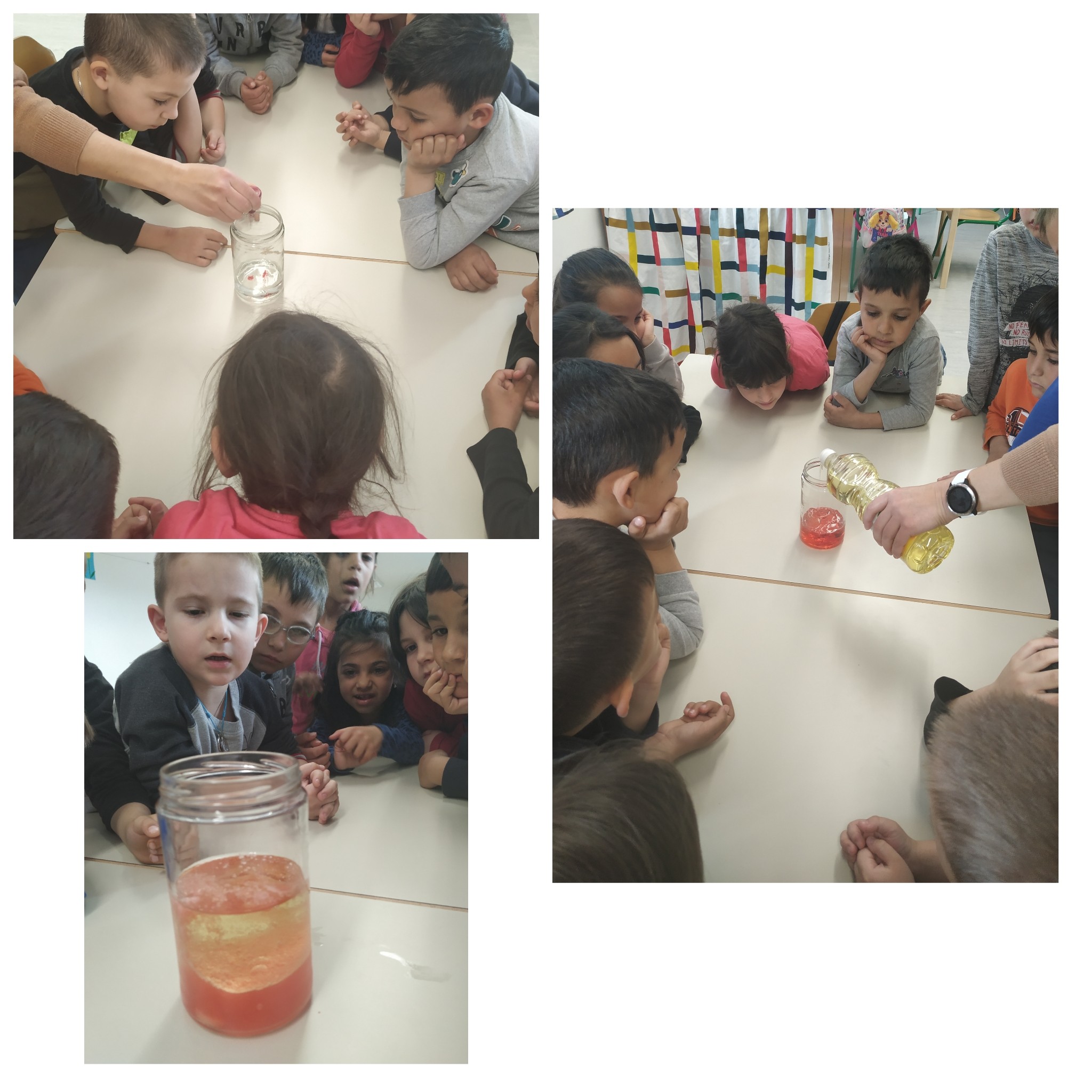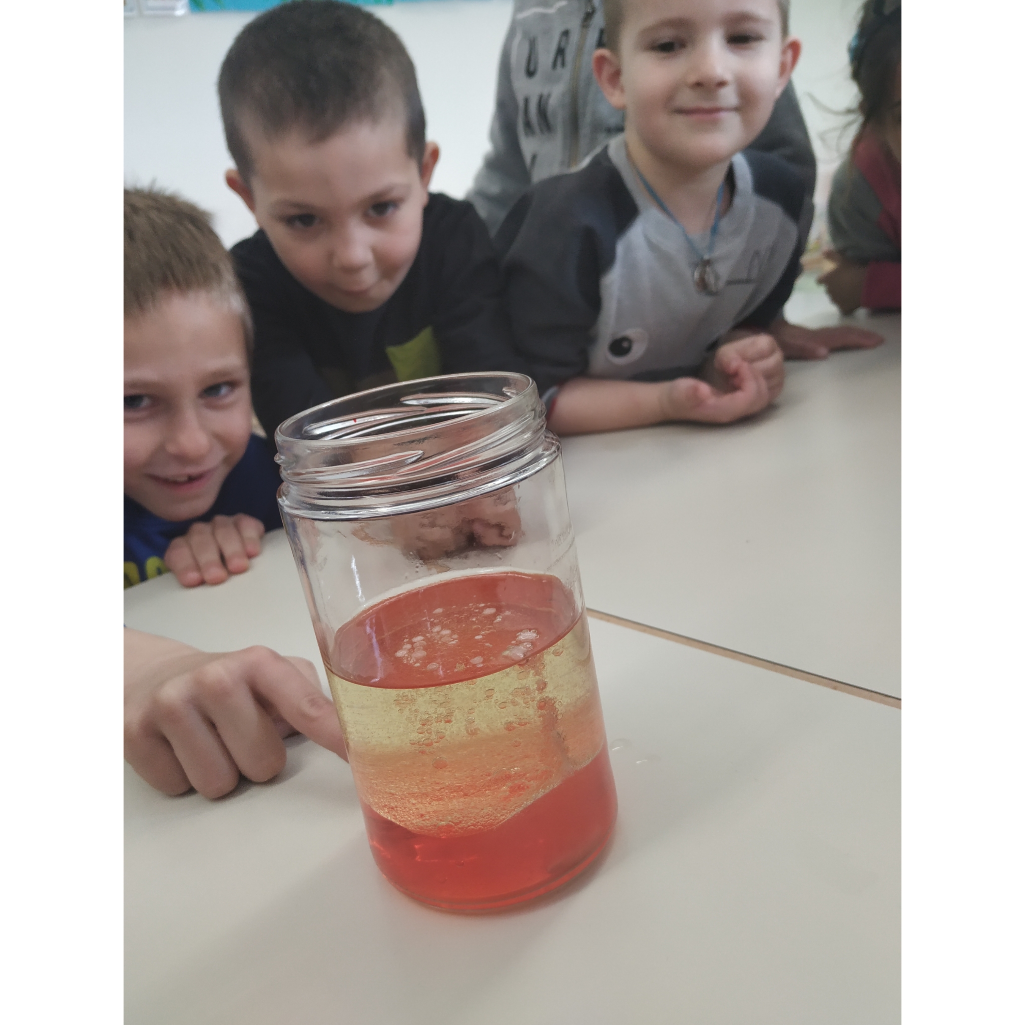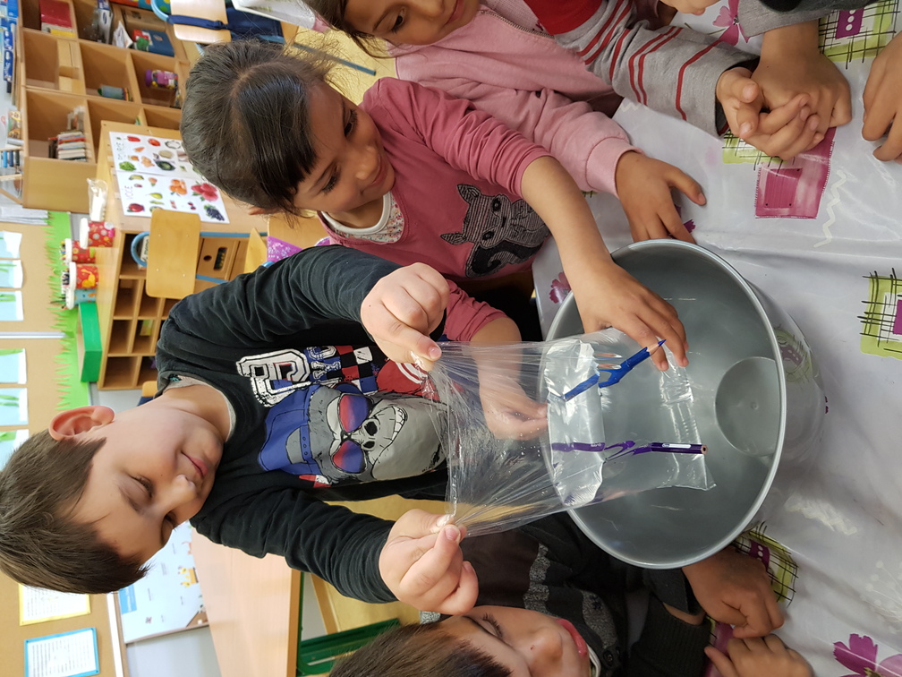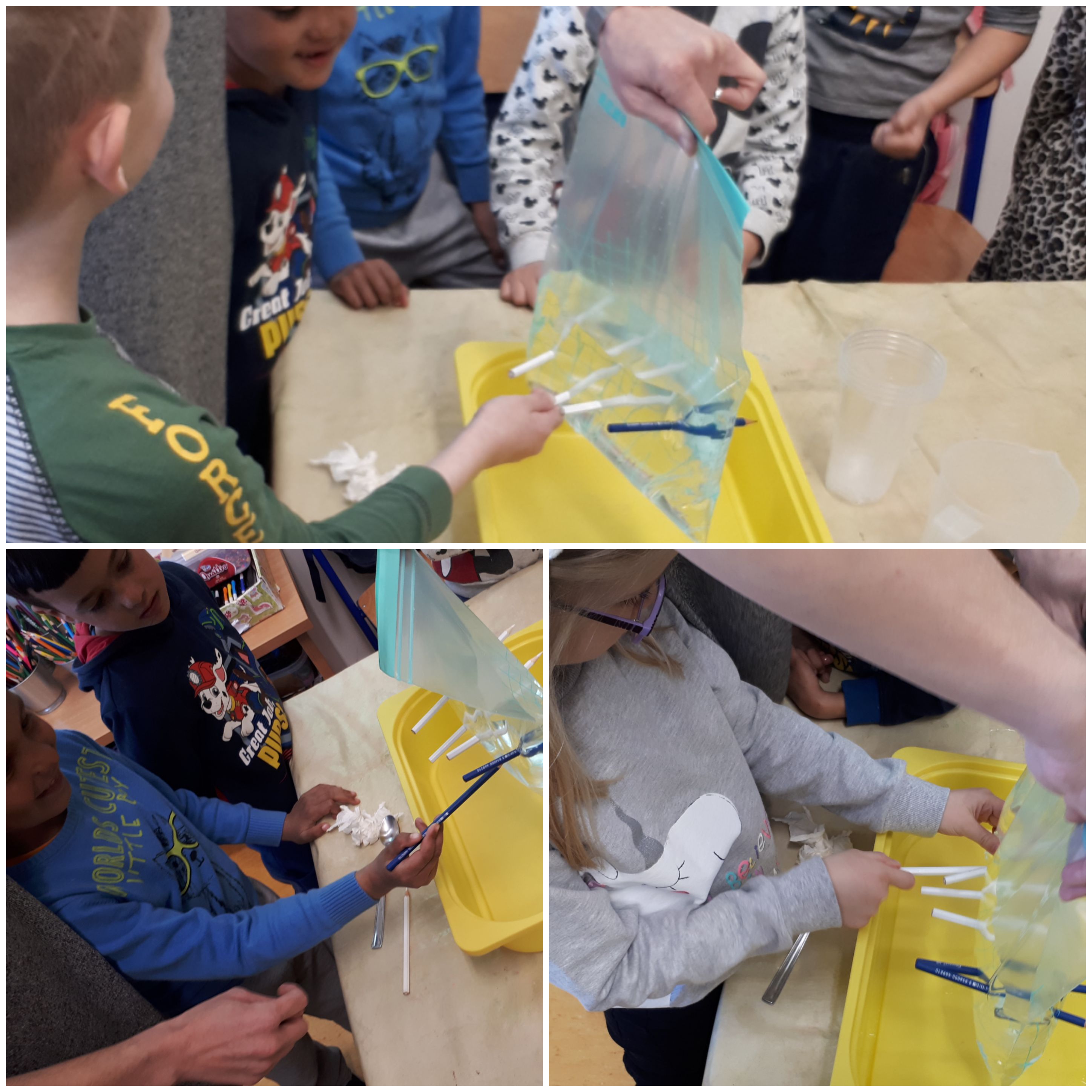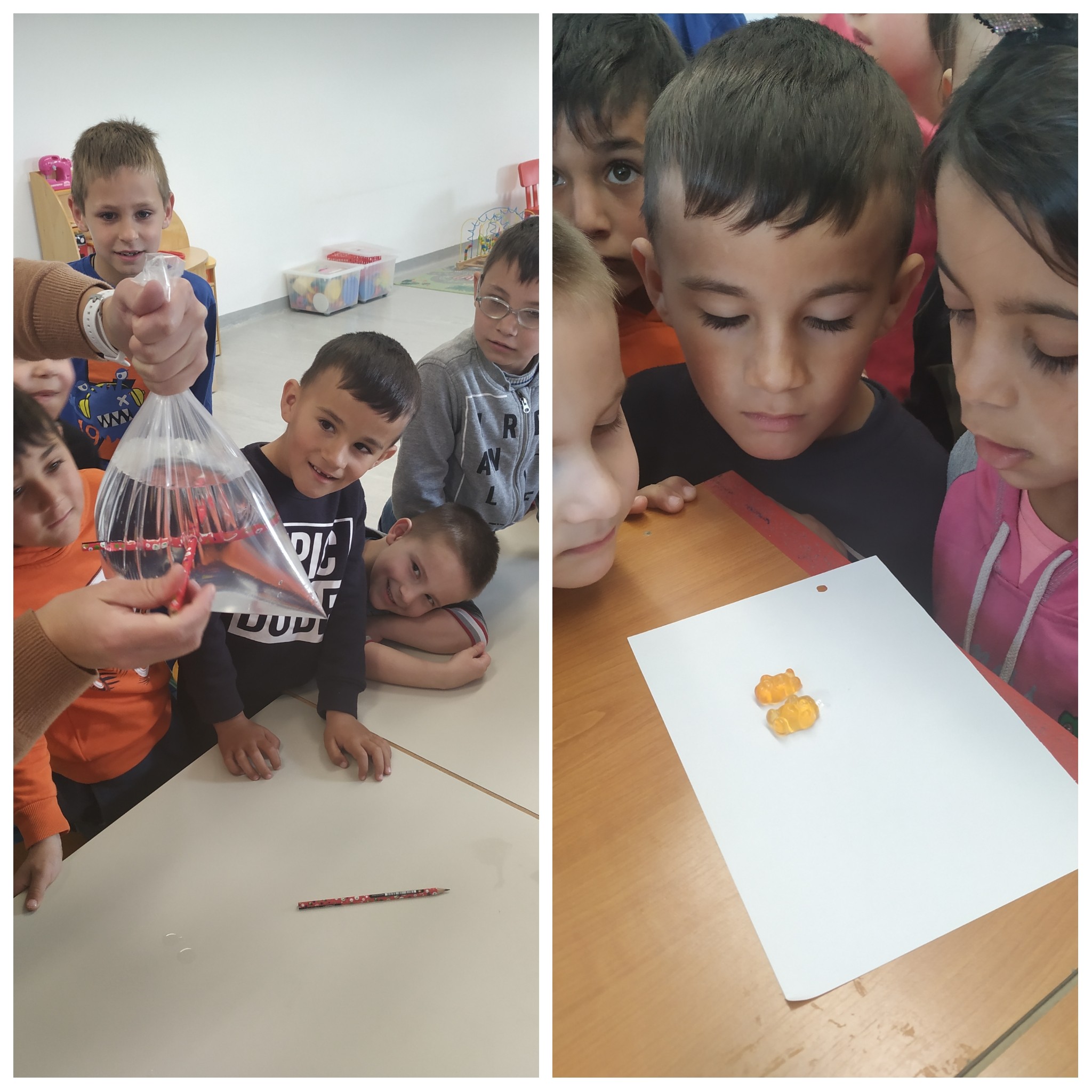Izvodili smo nekoliko pokusa. Bojicama smo bušili vrećicu punu vode i ostali iznenađeni što voda ne izlazi van. Svojim rukama smo otapali kockice leda i tražili male igračke u njima. Istraživali smo što se topi, a što ne topi u vodi (u čaše smo stavljali šećer, cedevitu, rižu i ulje).