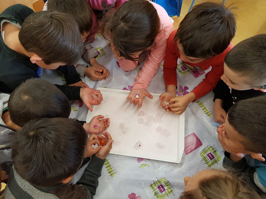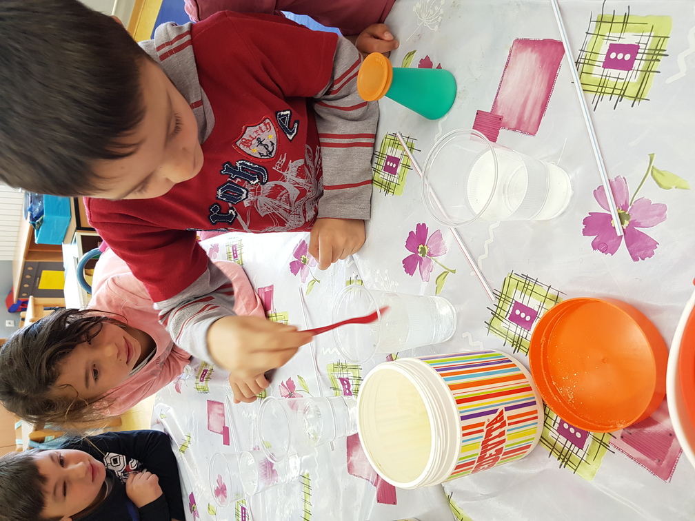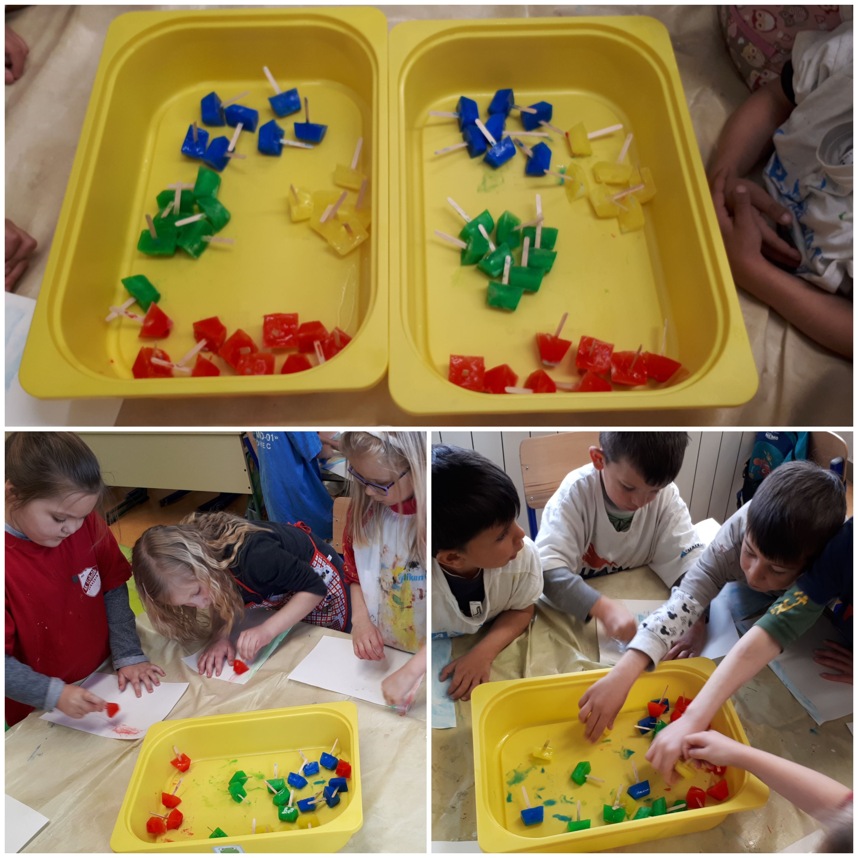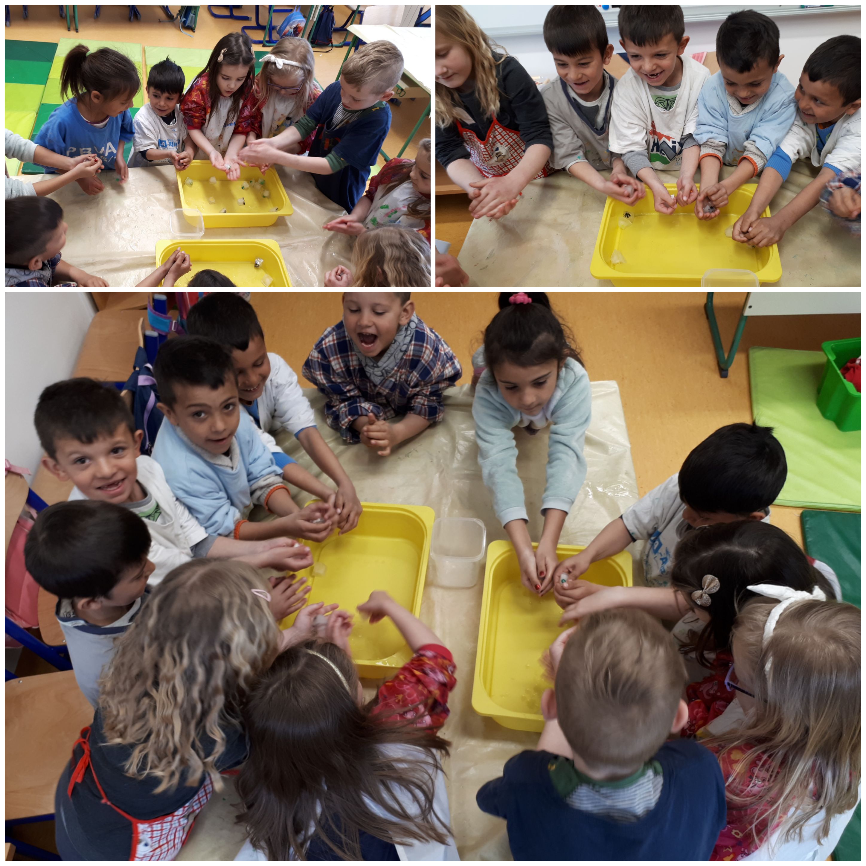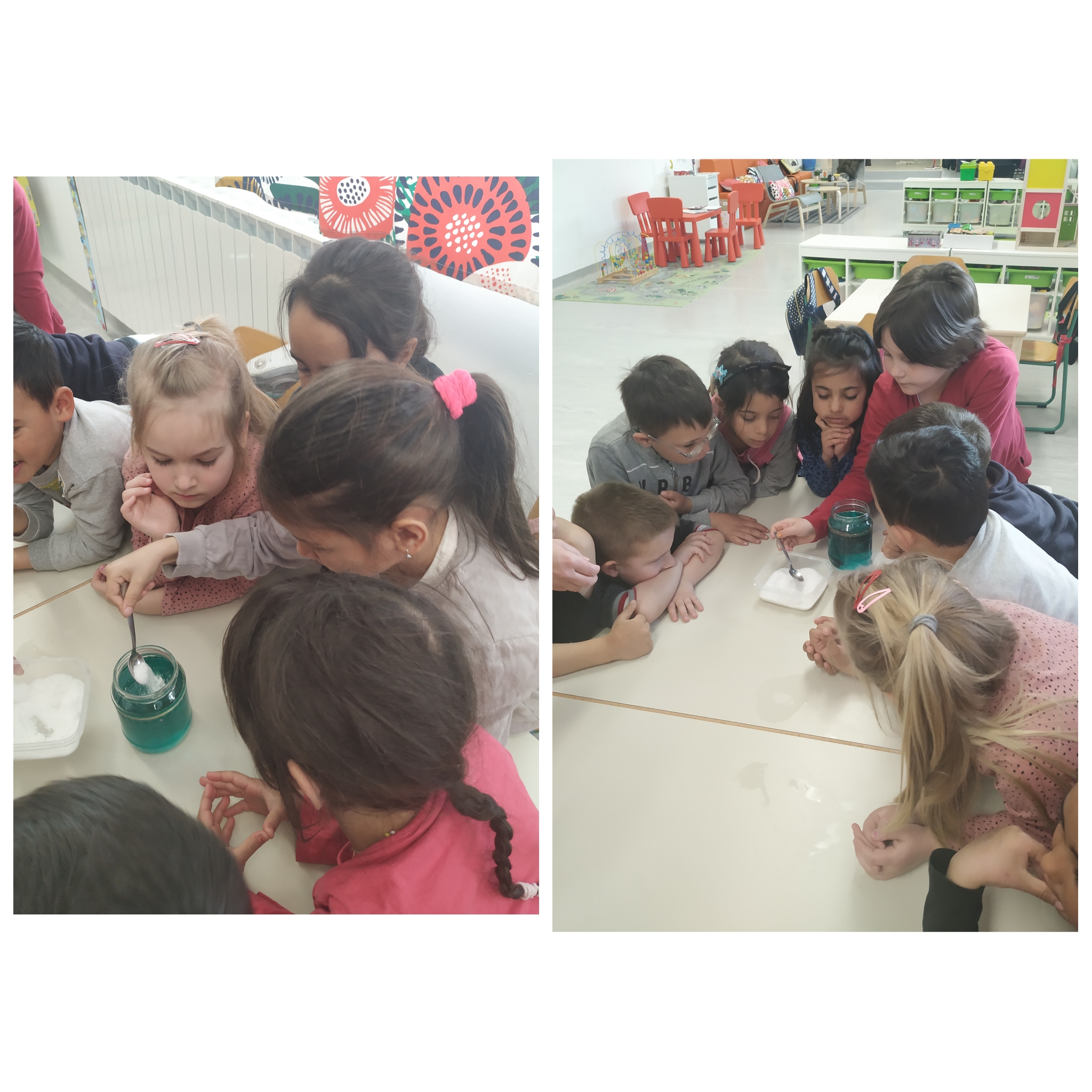 Izvodili smo nekoliko pokusa. Bojicama smo bušili vrećicu punu vode i ostali iznenađeni što voda ne izlazi van. Svojim rukama smo otapali kockice leda i tražili male igračke u njima. Istraživali smo što se topi, a što ne topi u vodi (u čaše smo stavljali šećer, cedevitu, rižu i ulje).