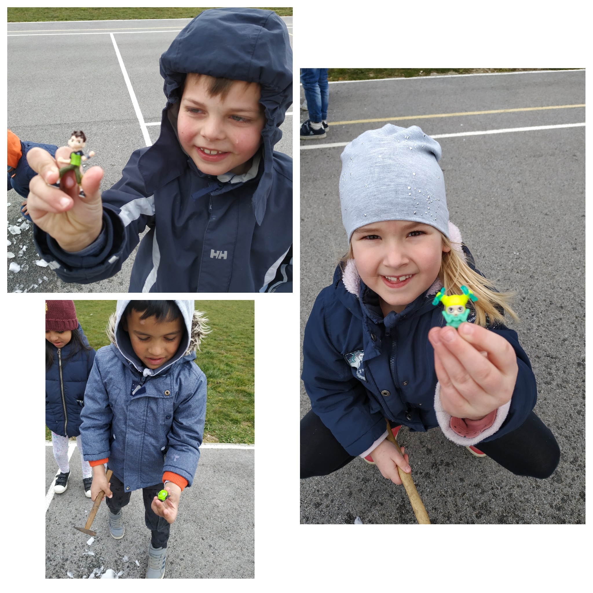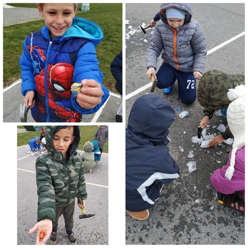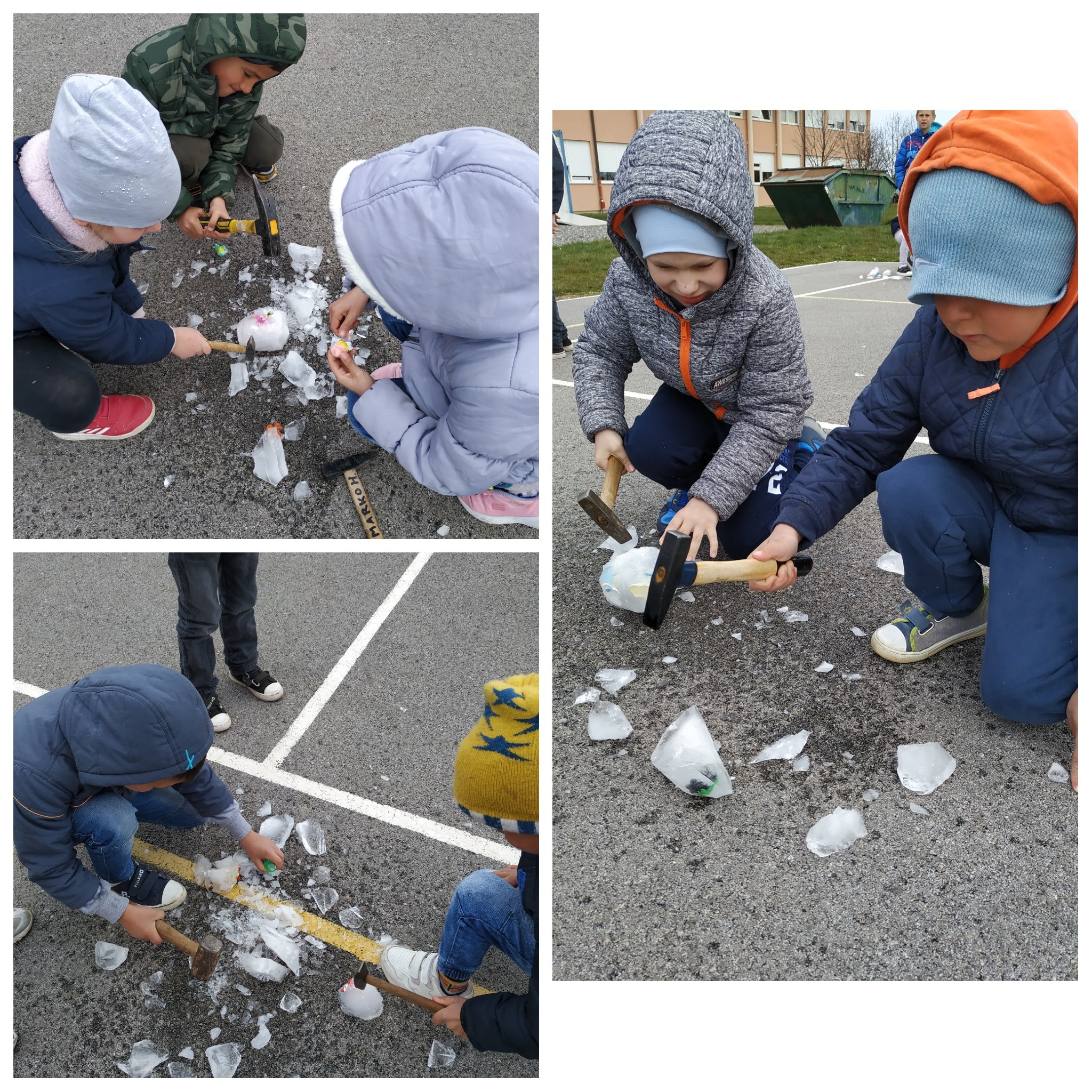 Na kraju smo izašli na školsko dvorište, uzeli čekiće u ruke i tražili „blago“ u ledu. Naučili smo da je led jako hladan i da se na kraju pretvara u vodu.