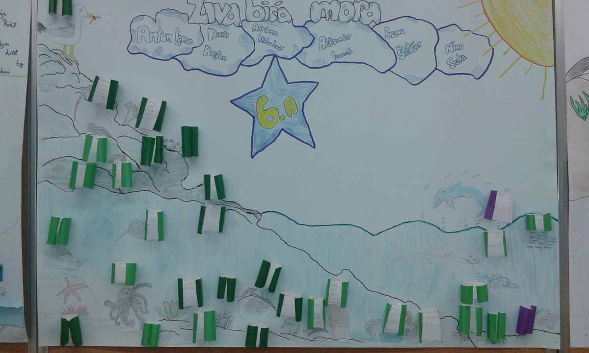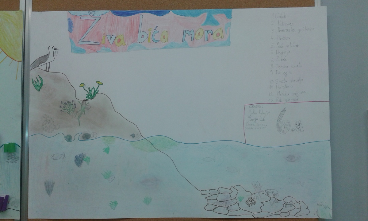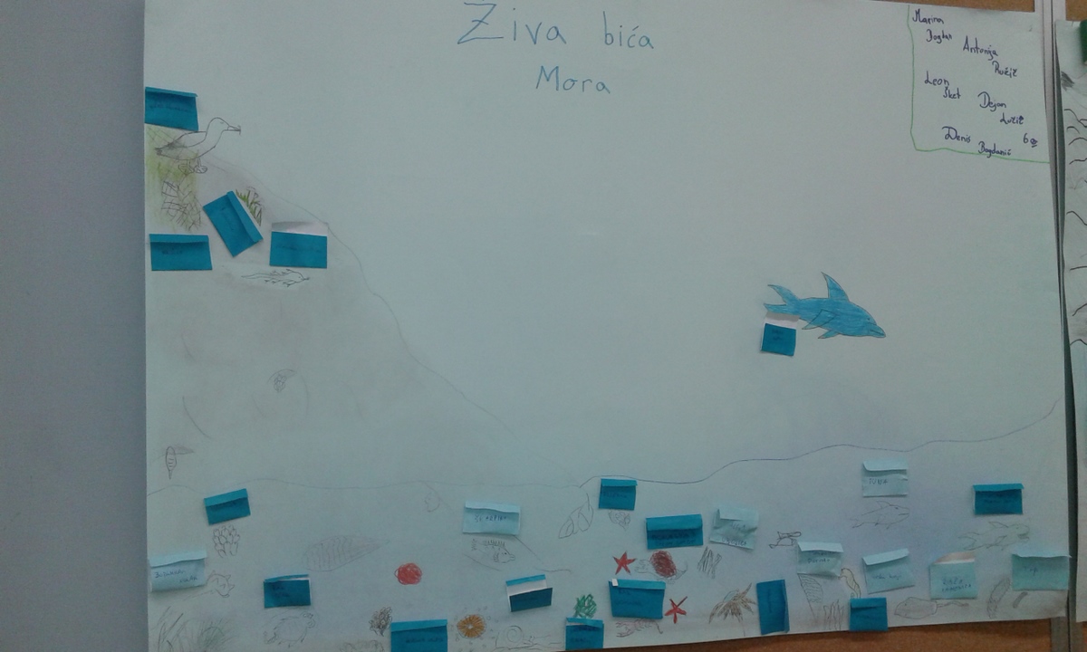 Na satu prirode učili smo o životinjama, biljkama i algama koje žive na različitim mjestima uz more i na različitim dubinama u moru. Budući da smo završili s tim gradivom, sat ponavljanja odradili smo na drugačiji način. Izrađivali smo 3D svijet mora. Podijelili smo se u grupe izvlačenjem papirića s različitim uzorcima (ljubičasti s leptirićima, s cvjetićima…). Najprije smo planirali naš rad, a zatim se dogovorili tko će imati koji posao u grupi. Jedni su crtali, drugi skicirali, treći pripremili osobne iskaznice živih bića. Rezultati su odlični!