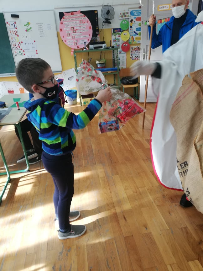 U ponedjeljak nam se želja ostvarila. Molitvom i pjesmom dočekali smo svetog Nikolu. Za nagradu dobili smo poklone koji su nas veoma obradovali. Nakon toga nastavili smo uređivati našu učionicu. Prozore smo ukrasili zaigranim pahuljicama, anđelima i snjegovićima. Složili smo pano u hodniku. Okitili smo bor različitim ukrasima. Dio ukrasa sami smo izradili.