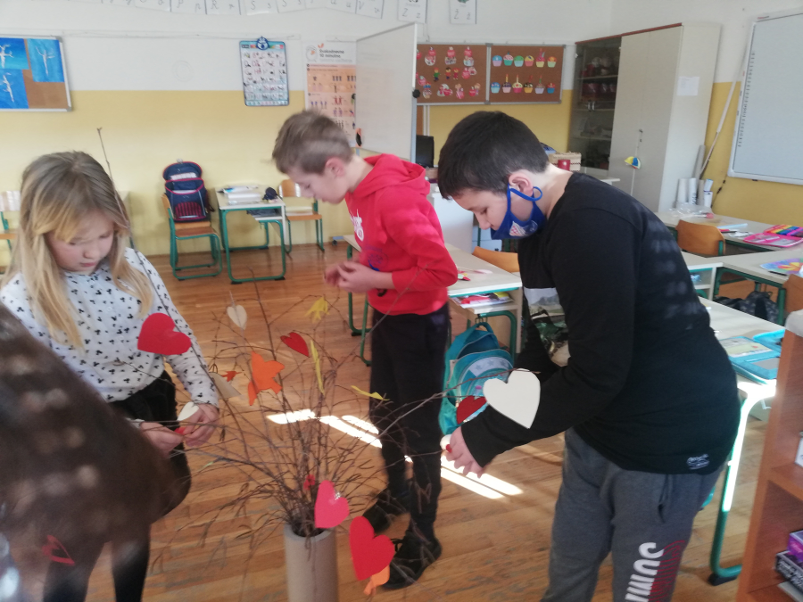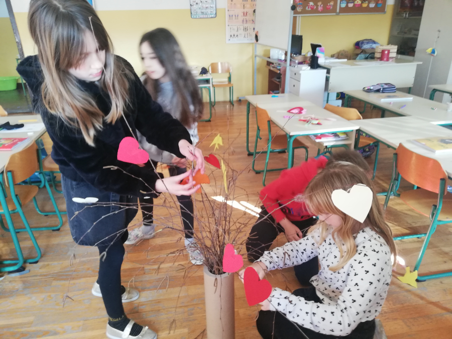 Razgovarali smo o ljubavi i kakve sve ljubavi mogu biti – prema mami i tati, prijatelju, prijateljici.. te pisali koga volimo. Saznali smo da ima i nekih simpatija u razredu. Premetanjem slova tražili smo riječi vezane uz Valentinovo, te čitali pjesmicu i razgovarali kakvim sve porukama možemo izraziti ljubav. Pjevali smo i slušali pjesme o ljubavi i malo zaplesali. Prigodno smo ukrasili razred i školu ftičekima i srcima.