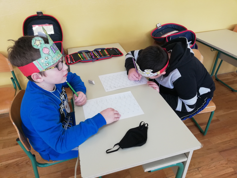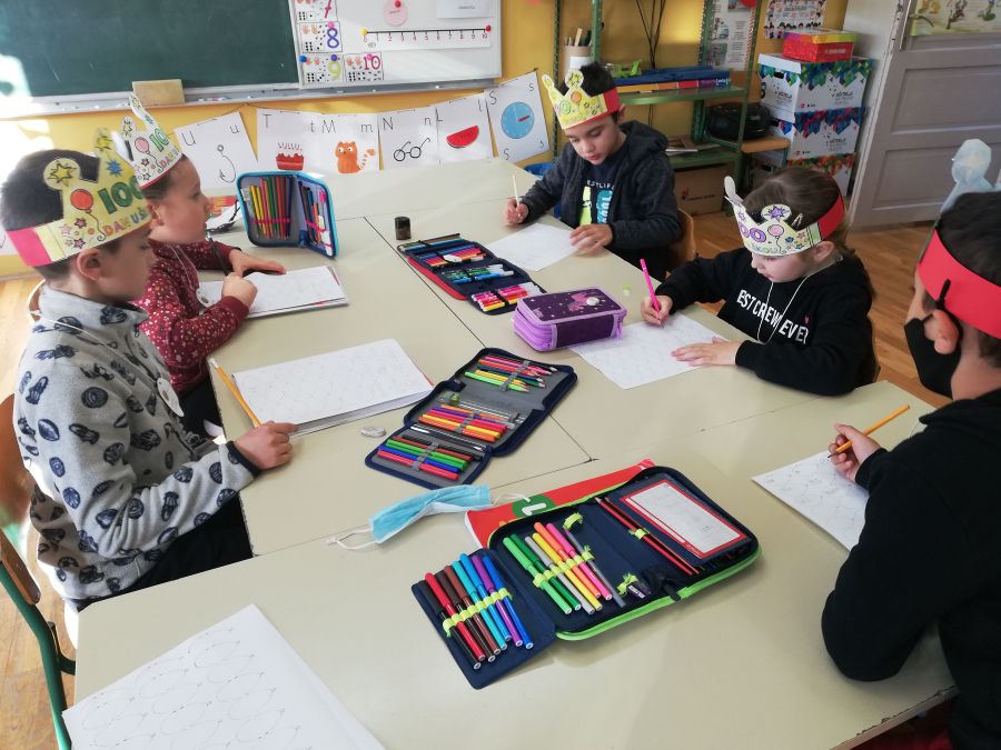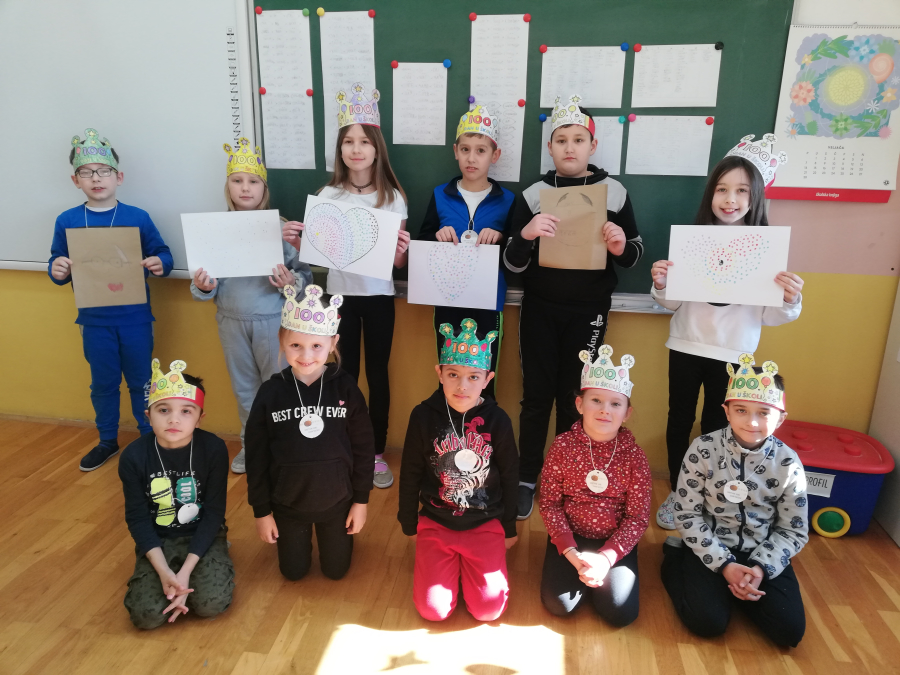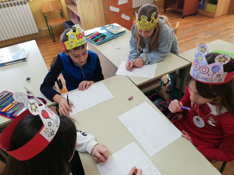 Stoti dan škole obilježili smo izradom krune i bedževa. Na satu hrvatskog jezika pisali smo 100 riječi tiskanim ili pisanim slovima, dok su učenici trećeg razreda tražili 100 riječi koje su sebi sadrže č/ć/dž/đ/ije/je, oslikavali smo srca sa 100 točkica i crtali sebe sa 100 godina. Vježbali smo 10 puta po 10 vježbi i razgibali se na satu TZK.