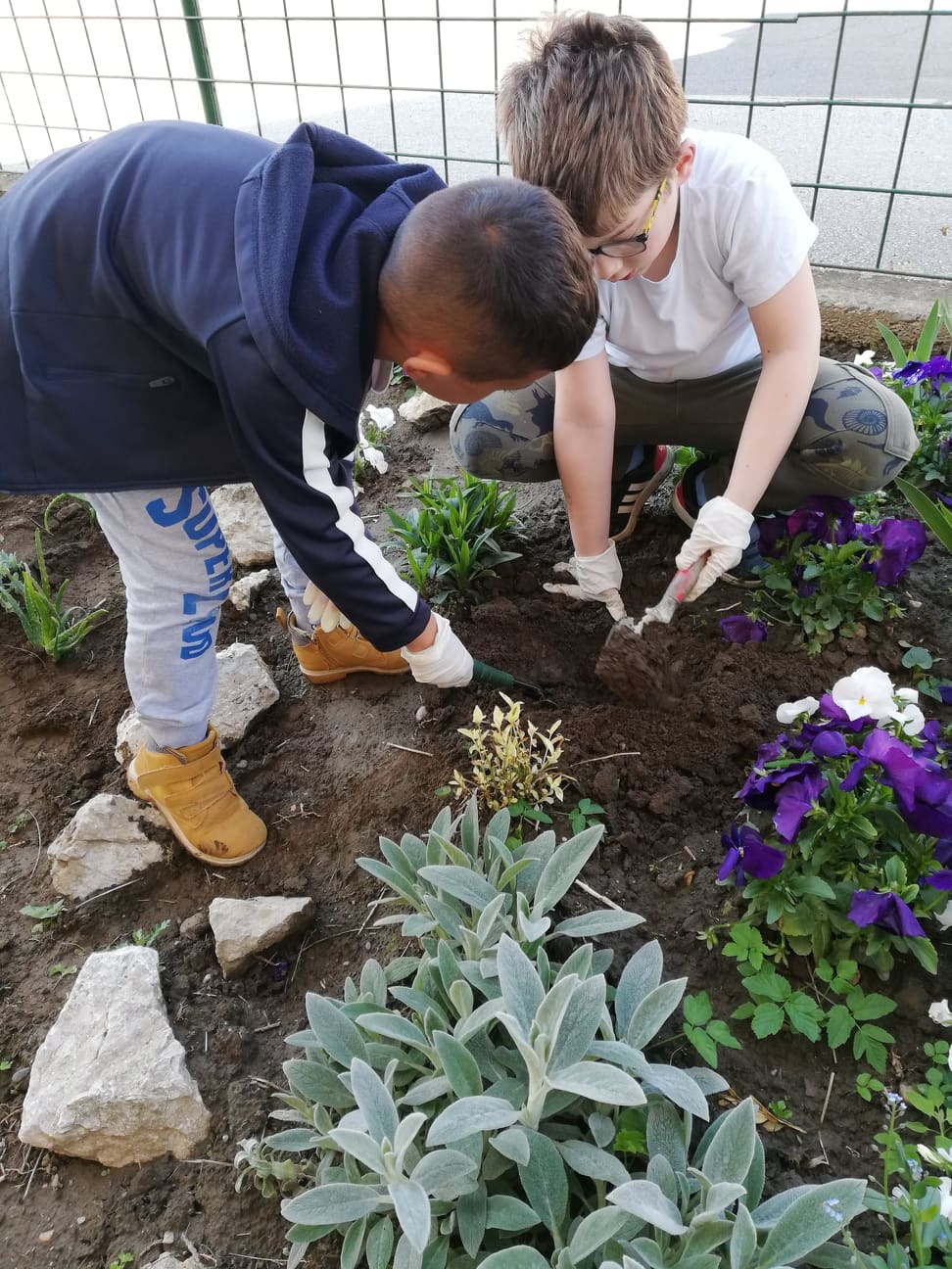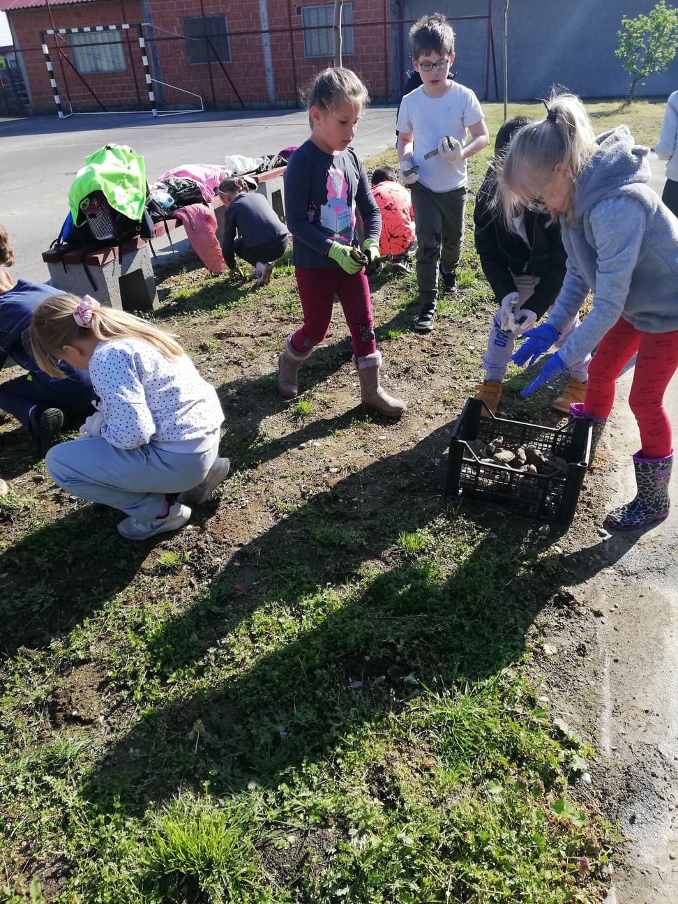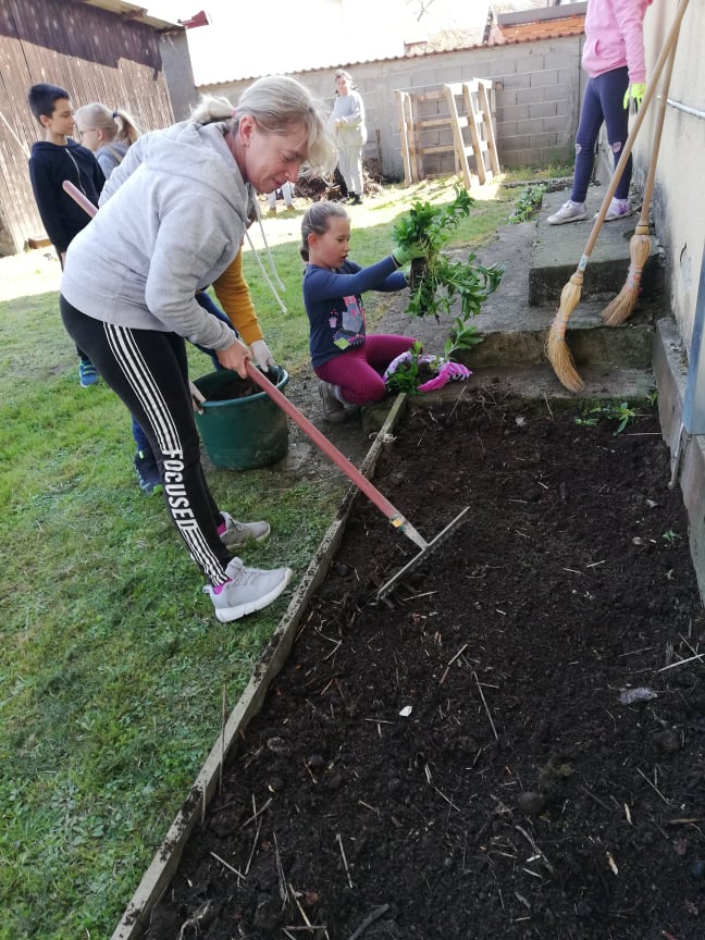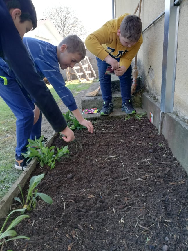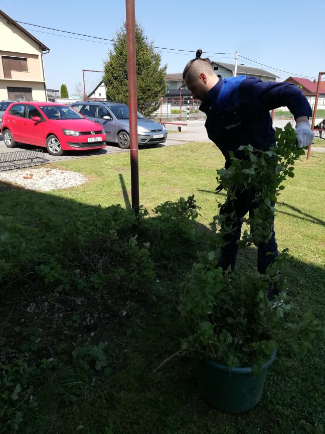 Podijelili smo se u manje grupice i prionuli poslu. Evo što smo sve radili: očistili smo dio travnjaka od kamenja tako da se može zasijati trava. Oplijevili smo jagode i čuvarkuće. U nove gredice nasipali smo zemlju iz našeg komposišta. Posadili smo cvijeće i jagode i posijali različite vrste cvijeća. Uz pomoć jednog tate i tri bake uredili smo gredicu kupina. Za novo komposište brusnim papirom izbrusili smo palete tako da ih možemo obojiti. Ispred škole zasadili smo nekoliko trajnica. Očistili smo stepenice od mahovine.