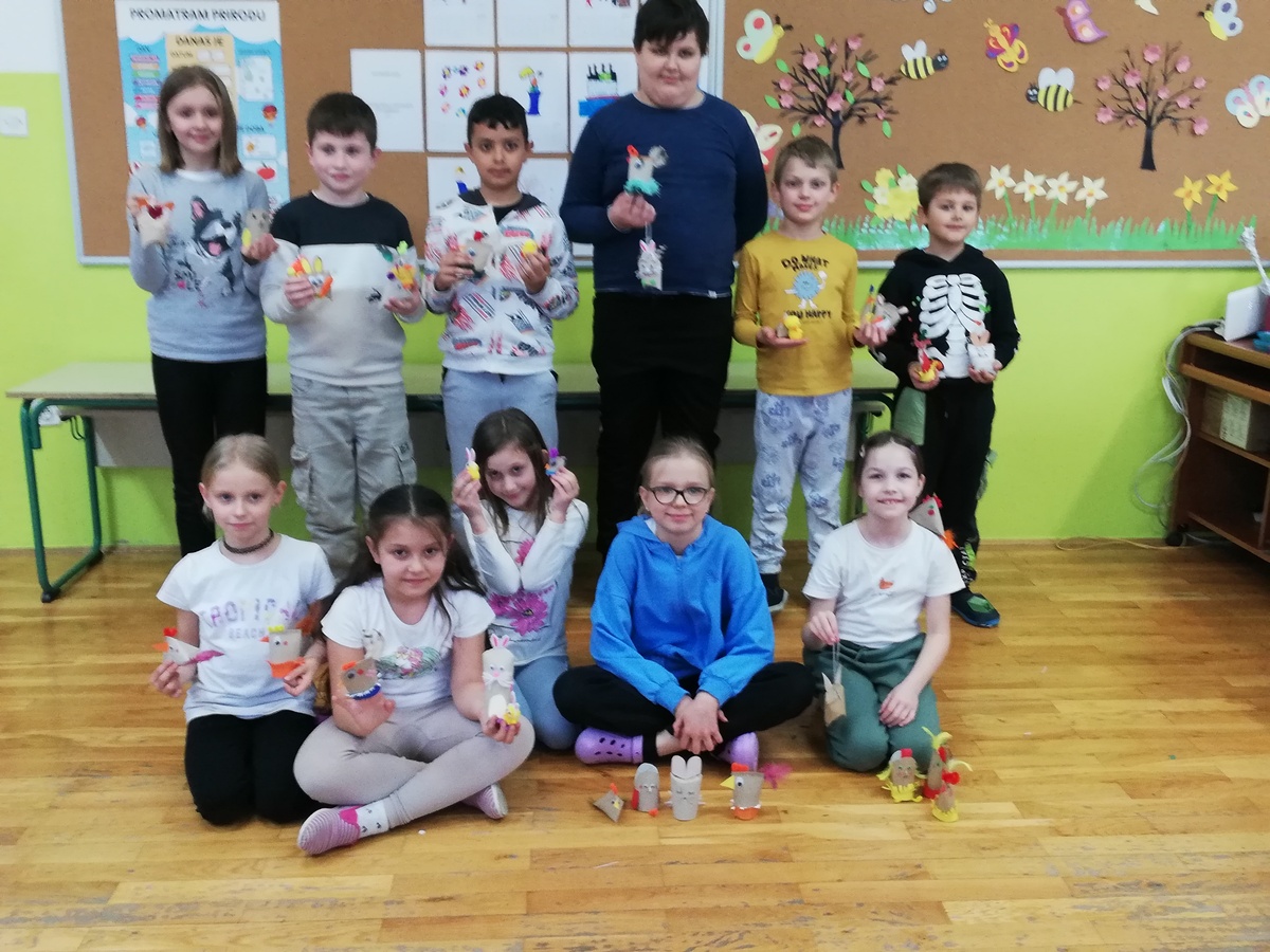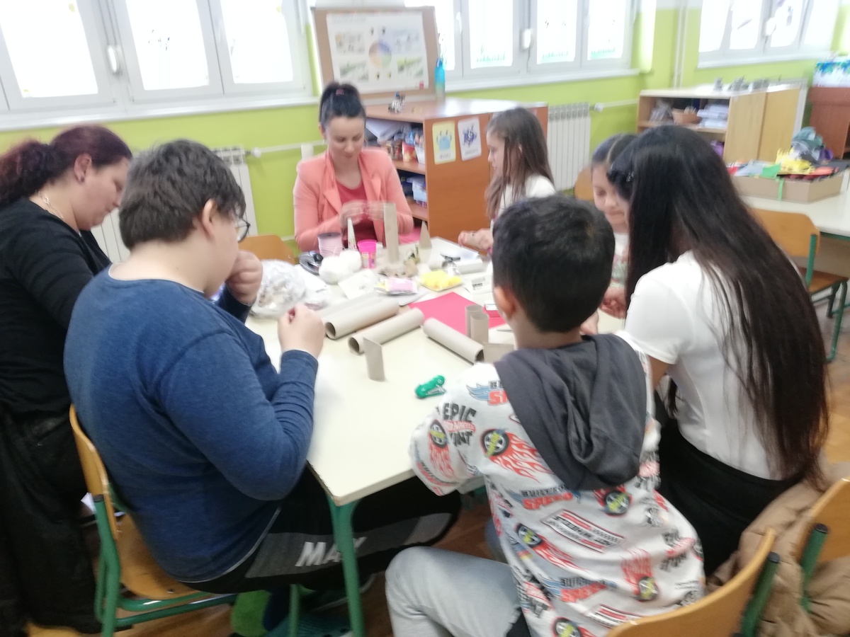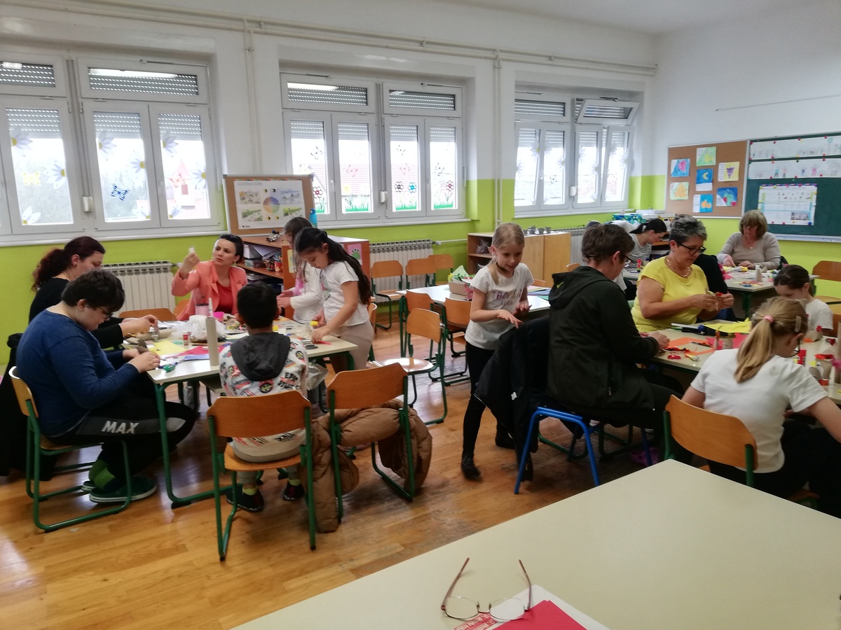 U vedroj, opuštenoj i kreativnoj atmosferi vješte ruke roditelja/baka i učenika izradile su koke, pjetliće, piliće i zečiće od kartonskih tuljaca. U trenucima predaha druženje je nastavljeno uz sok i grickalice.