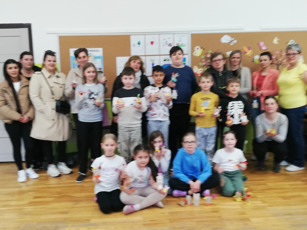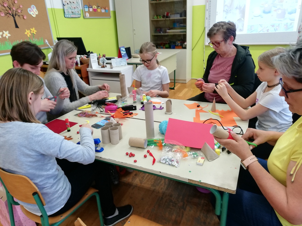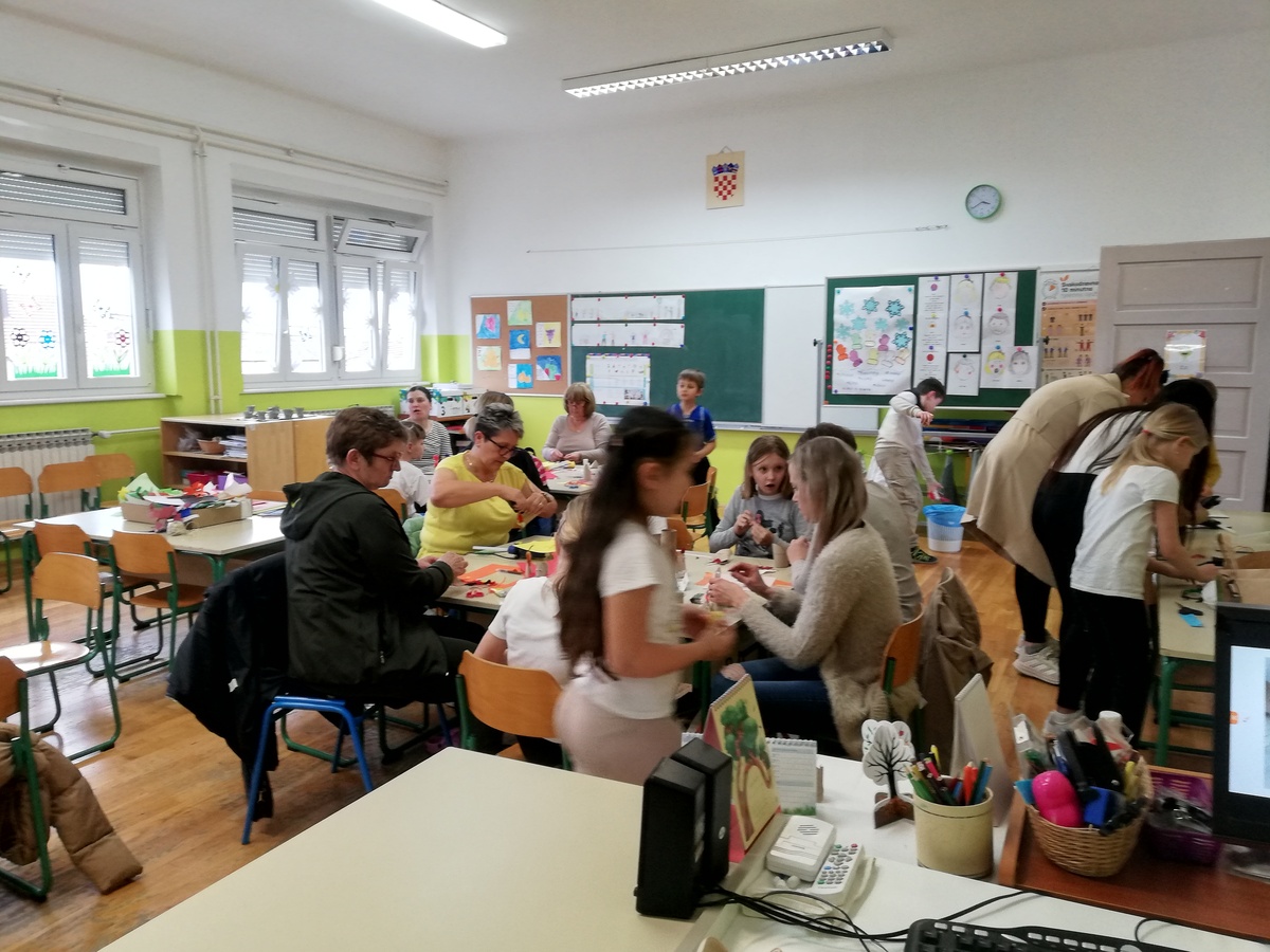 U vedroj, opuštenoj i kreativnoj atmosferi vješte ruke roditelja/baka i učenika izradile su koke, pjetliće, piliće i zečiće od kartonskih tuljaca. U trenucima predaha druženje je nastavljeno uz sok i grickalice.