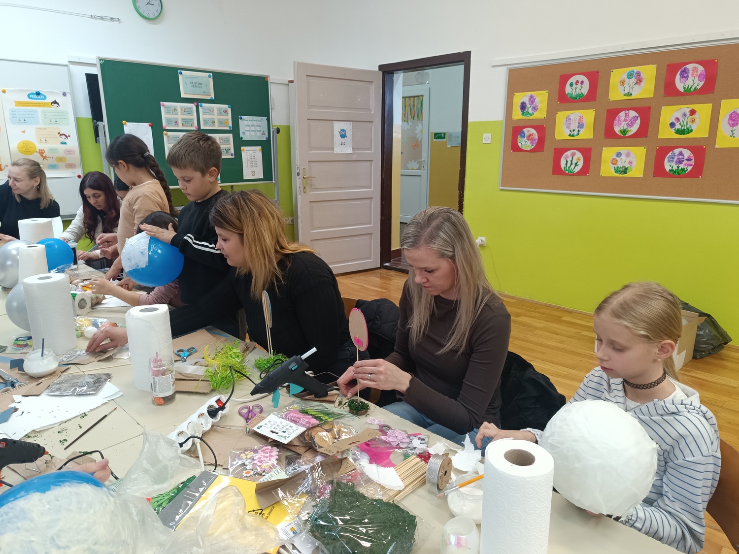 U veseloj i kreativnoj atmosferi spretne ruke roditelja, baka i učenika izradile su koke i piliće od kartona i kaširanog papira balona.