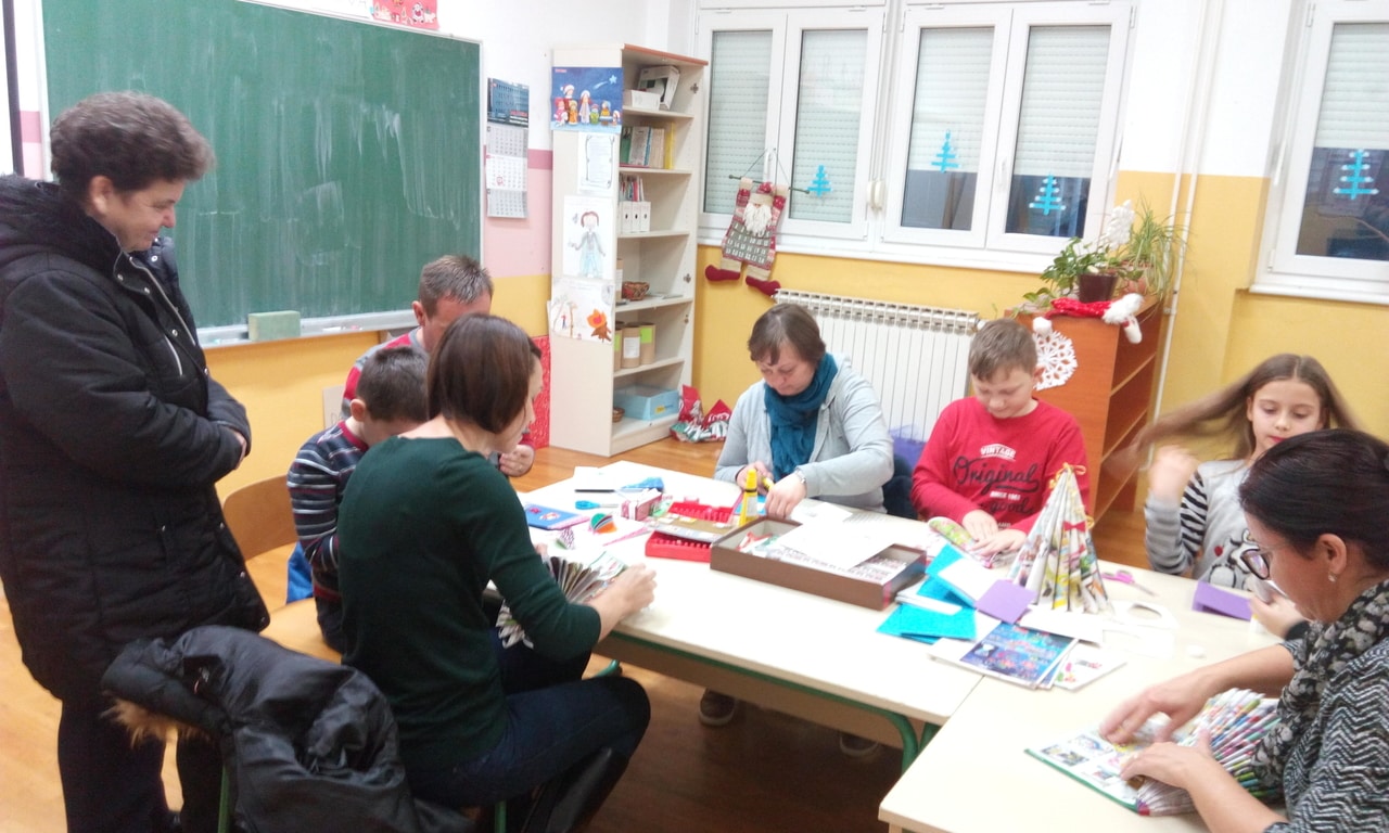 Na početku druženja učenici su izveli kratki prigodni program za roditelje, a nakon toga slijedio je rad u radionicama. Učenici i njihovi roditelji (bake, braća) zajedno su izrađivali božićne čestitke, jelke, snjegoviće i svijećnjake.