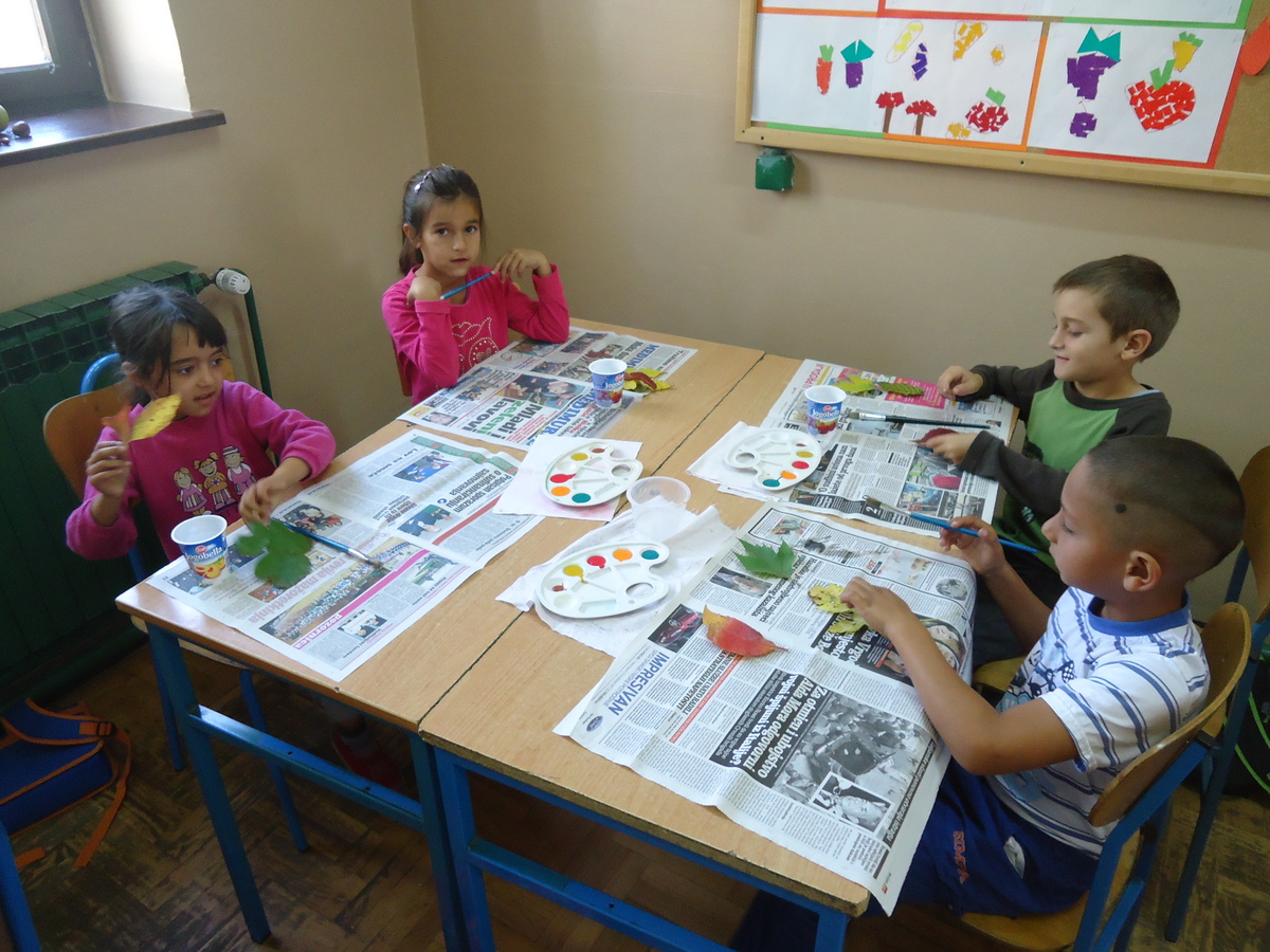 Jeste li znali da jesen ima i svoje podanike? U posjeti su kod nas u boravku. To su čudovišta od lišća. Izradili su ih, od tuljaca i lišća, treći razredi. Da mašta radi svašta, pokazali su učenici četvrtih razreda koji su sa lišćem naslikali životinje. Tako je nastao mali zoološki vrt. I prvašići su se igrali lišćem – oni su radili otiske od lišća i stvorili predivnu jesensku sliku. Ima jesen i svoj zbor, zbor ježića koji zna baš sve jesenske pjesme. Kovrčave ježiće izradili su učenici drugih razreda.